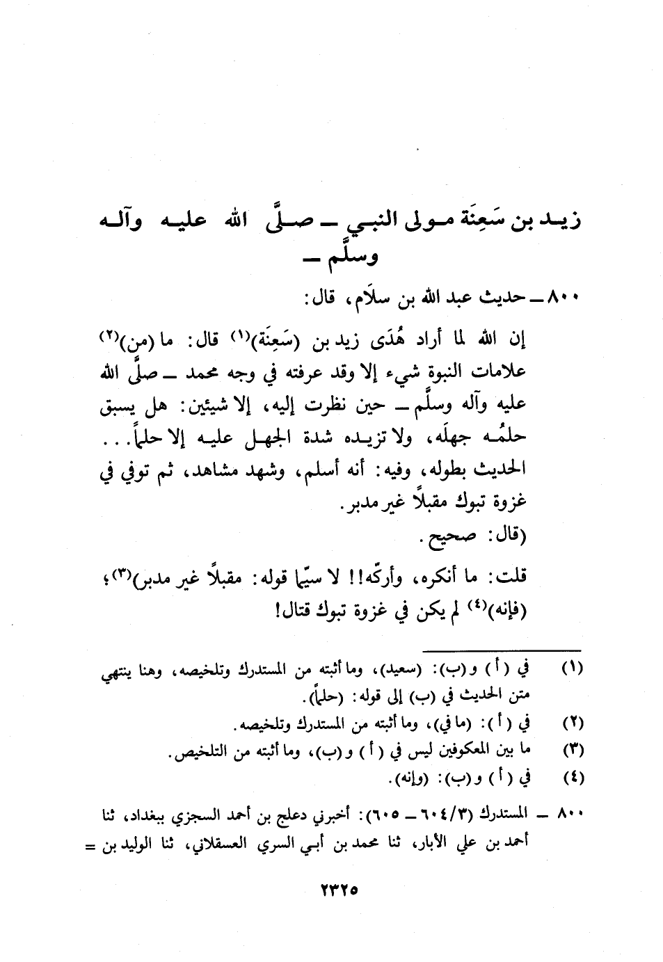 إن الله لما أراد هُدَى زيد بن (سَعِنَة) (¬1) قال: ما (من) (¬2) علامات النبوة شيء إلا وقد عرفته في وجه محمد -صلى الله عليه وآله وسلَّم- حين نظرت إليه، إلا شيئين: هل يسبق حلمُه جهلَه، ولا تزيده شدة الجهل عليه إلا حلماً ... الحديث بطوله، وفيه: أنه أسلم، وشهد مشاهد، ثم توفي في غزوة تبوك مقبلاً غير مدبر.