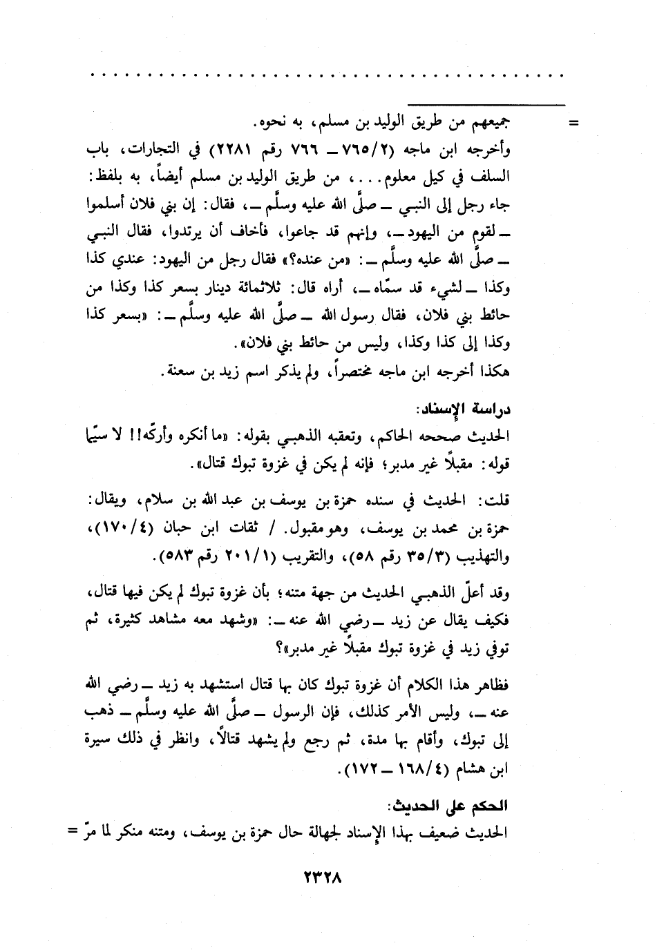 وقد أعلّ الذهبي الحديث من جهة متنه؛ بأن غزوة تبوك لم يكن فيها قتال، فكيف يقال عن زيد -رضي الله عنه-: "وشهد معه مشاهد كثيرة، ثم توفي زيد في غزوة تبوك مقبلًا غير مدبر"؟