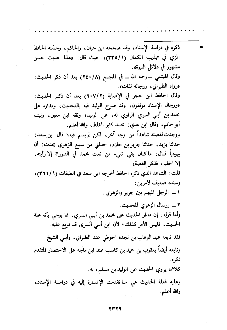 وقال الحافظ ابن حجر في الإصابة (2/ 607) بعد أن ذكر الحديث: "ورجال الإسناد موثقون، وقد صرح الوليد فيه بالتحديث، ومداره على محمد بن أبي السري الراوي له، عن الوليد؛ وثقه ابن معين، ولينه أبو حاتم، وقال ابن عدي: محمد كثير الغلط، والله أعلم.