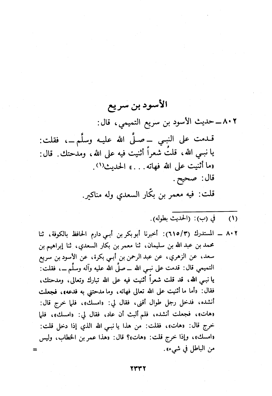 802 - المستدرك (3/ 615): أخبرنا أبو بكر بن أبي دارم الحافظ بالكوفة، ثنا محمد بن عبد الله بن سليمان، ثنا معمر بن بكار السعدي، ثنا إبراهيم بن سعد، عن الزهري، عن عبد الرحمن بن أبي بكرة، عن الأسود بن سريع التميمي قال: قدمت على نبي الله -صلى الله عليه وآله وسلم-، فقلت: يا نبي الله، قد قلت شعراً أثنيت فيه على الله تبارك وتعالى، ومدحتك، فقال: " أما ما أثنيت على الله تعالى فهاته، وما مدحتني به فدعه"، فجعلت أنشده، فدخل رجل طوال أقنى، فقال لي: "امسك"، فلما خرج قال: "هات"، فجعلت أنشده، فلم ألبث أن عاد، فقال لي: "امسك"، فلما خرج قال: "هات"، فقلت: من هذا يا نبي الله الذي إذا دخل قلت: "امسك"، وإذا خرج قلت: "هات"؟ قال: "هذا عمر بن الخطاب، وليس من الباطل في شيء". =