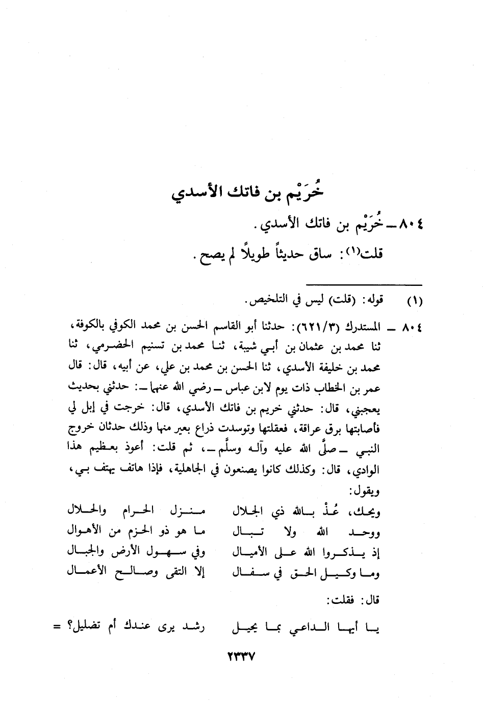 804 - المستدرك (3/ 621): حدثنا أبو القاسم الحسن بن محمد الكوفي بالكوفة، ثنا محمد بن عثمان بن أبي شيبة، ثنا محمد بن تسنيم الحضرمي، ثنا محمد بن خليفة الأسدي، ثنا الحسن بن محمد بن علي، عن أبيه، قال: قال عمر بن الخطاب ذات يوم لابن عباس -رضي الله عنهما-: حدثني بحديث يعجبني، قال: حدثني خريم بن فاتك الأسدي، قال: خرجت في إبل لي فأصابتها برق عراقة، فعقلتها وتوسدت ذراع بعير منها وذلك حدثان خروج النبي -صلى الله عليه وآله وسلم-، ثم قلت: أعوذ بعظيم هذا الوادي، قال: وكذلك كانوا يصنعون في الجاهلية، فإذا هاتف يهتف بي، ويقول: