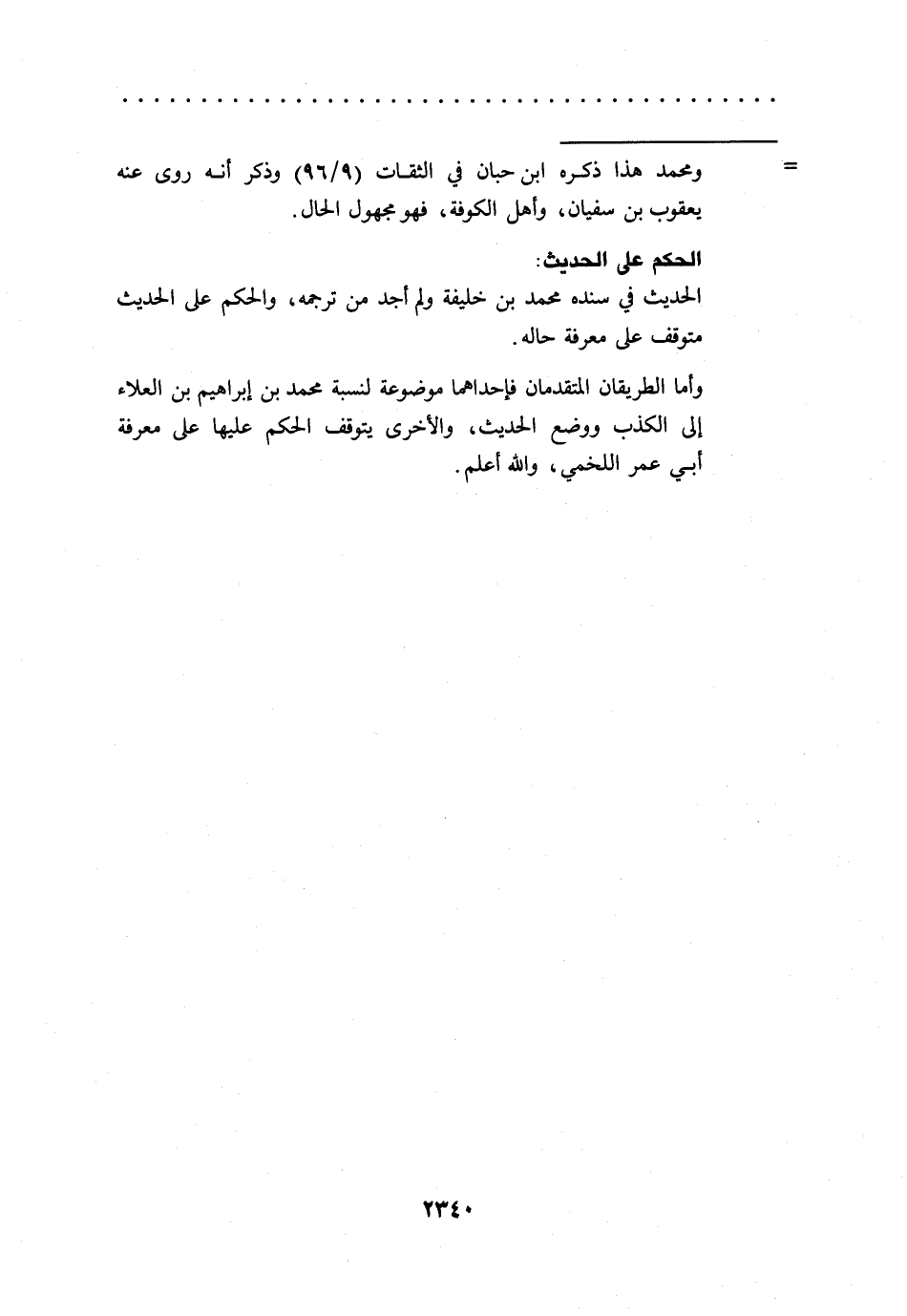 = ومحمد هذا ذكره ابن حبان في الثقات (9/ 96) وذكر أنه روى عنه يعقوب بن سفيان، وأهل الكوفة، فهو مجهول الحال.
