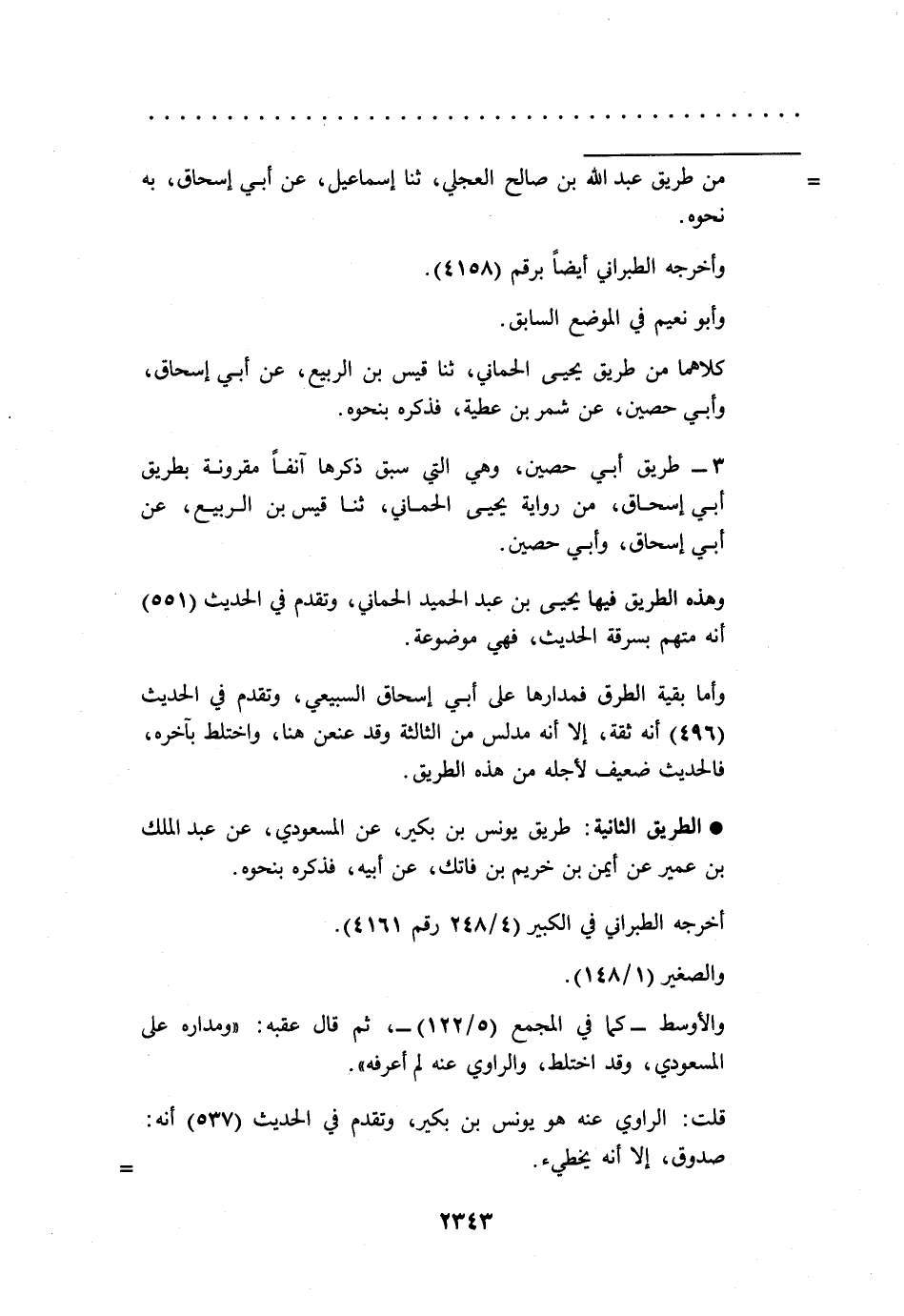 3 - طريق أبي حصين، وهي التي سبق ذكرها آنفاً مقرونة بطريق أبي إسحاق، من رواية يحيى الحماني، ثنا قيس بن الربيع، عن أبي إسحاق، وأبي حصين.