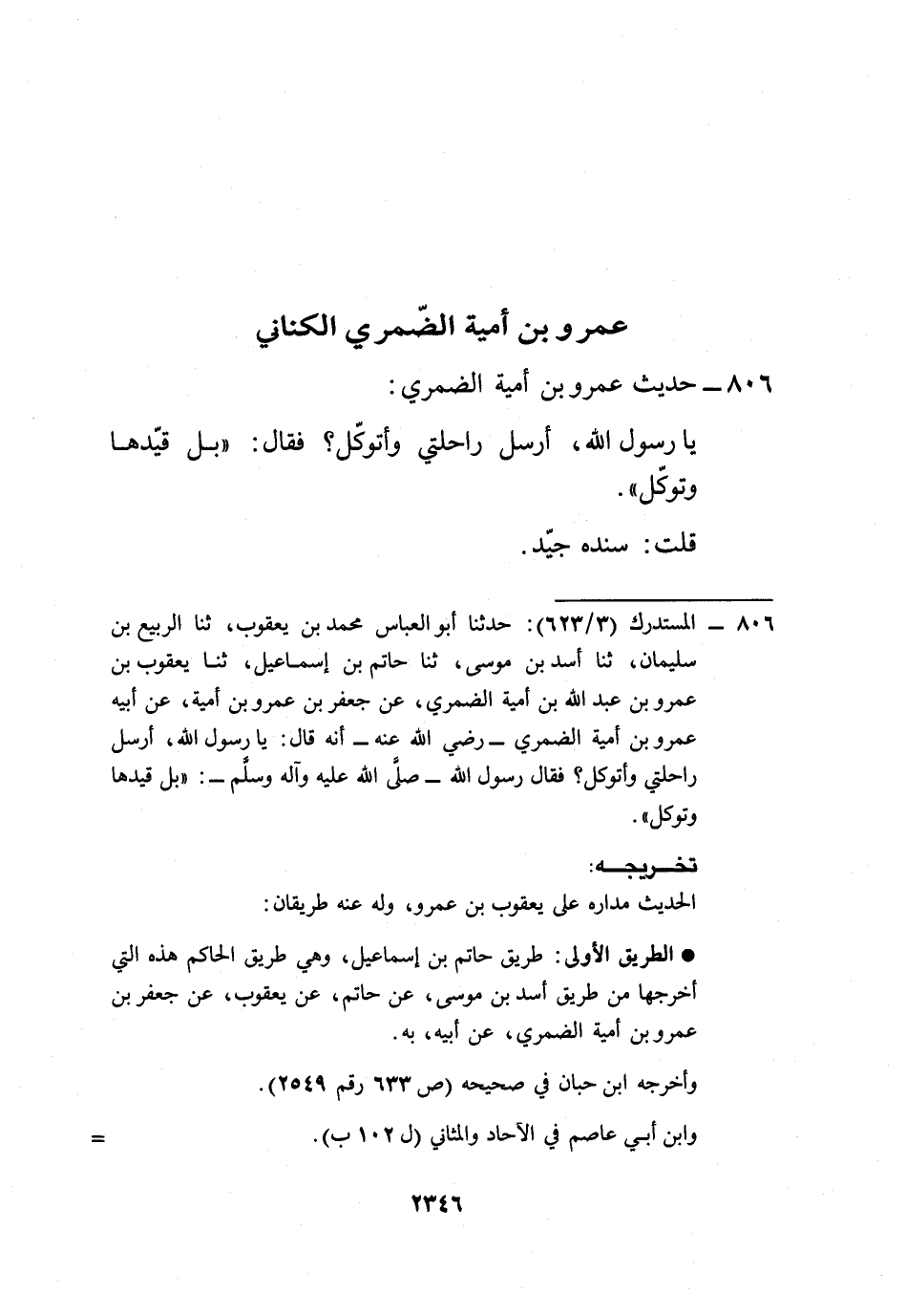 806 - المستدرك (3/ 623): حدثنا أبو العباس محمد بن يعقوب، ثنا الربيع بن سليمان، ثنا أسد بن موسى، ثنا حاتم بن إسماعيل، ثنا يعقوب بن عمرو بن عبد الله بن أمية الضمري، عن جعفر بن عمرو بن أمية، عن أبيه عمرو بن أمية الضمري -رضي الله عنه- أنه قال: يا رسول الله، أرسل راحلتي وأتوكل؟ فقال رسول الله -صلى الله عليه وآله وسلم-: "بل قيدها وتوكل".
