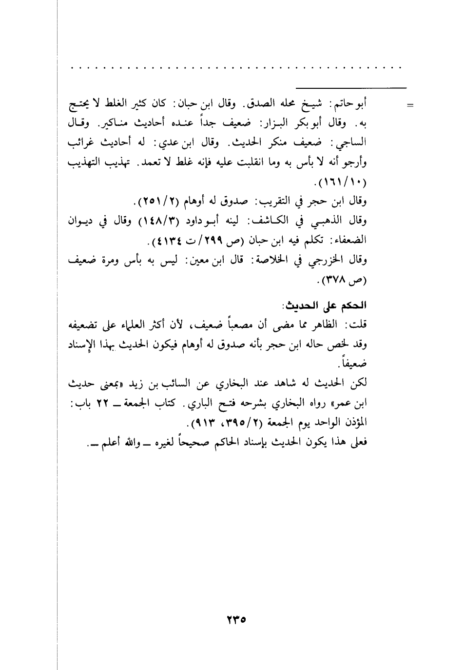 لكن الحديث له شاهد عند البخاري عن السائب بن زيد "بمعنى حديث ابن عمر" رواه البخاري بشرحه فتح الباري. كتاب الجمعة- 22 باب: المؤذن الواحد يوم الجمعة (2/ 395، 913).