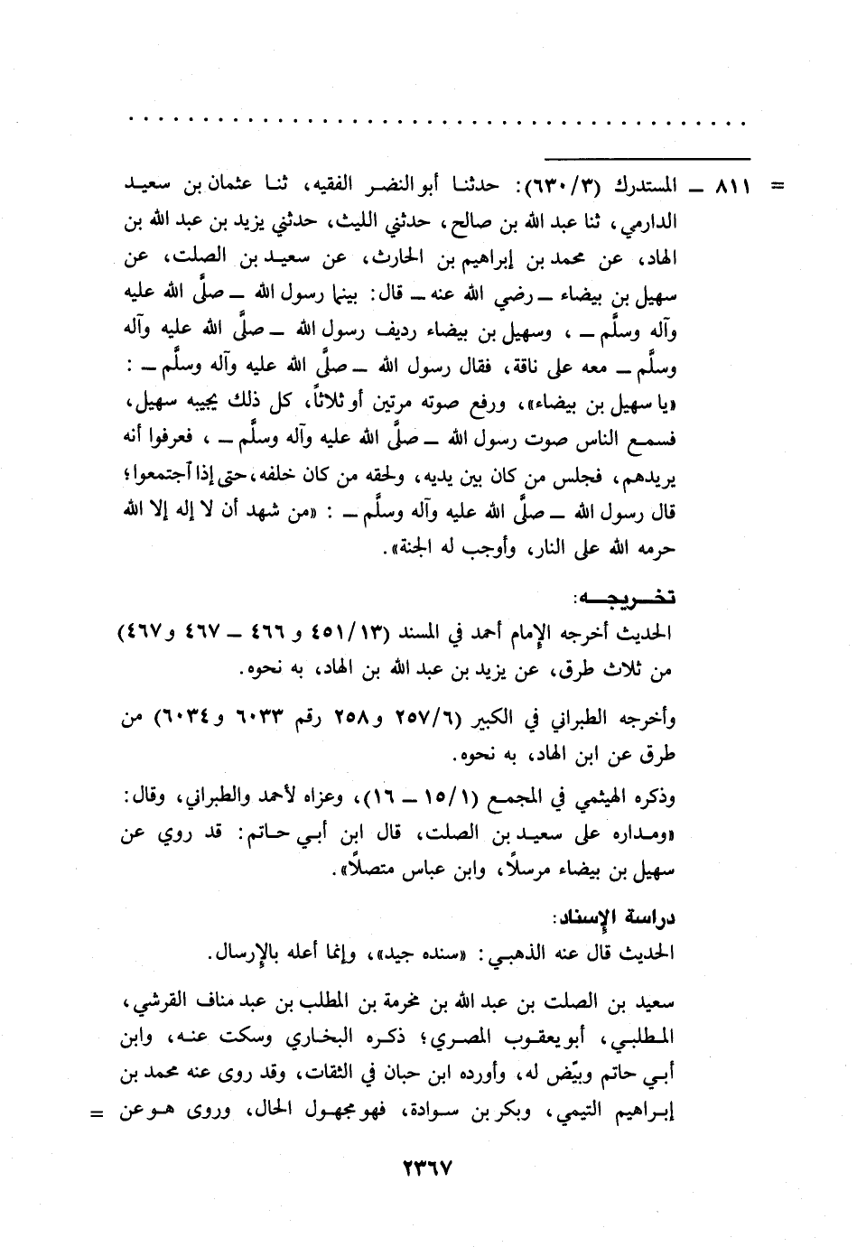 = 811 - المستدرك (3/ 630): حدثنا أبو النضر الفقيه، ثنا عثمان بن سعيد الدارمي، ثنا عبد الله بن صالح، حدثني الليث، حدثني يزيد بن عبد الله بن الهاد، عن محمد بن إبراهيم بن الحارث، عن سعيد بن الصلت، عن سهيل بن بيضاء -رضي الله عنه- قال: بينما رسول الله -صلى الله عليه وآله وسلم-، وسهيل بن بيضاء رديف رسول الله -صلى الله عليه وآله وسلم- معه على ناقة، فقال رسول الله -صلى الله عليه وآله وسلم-: "يا سهيل بن بيضاء"، ورفع صوته مرتين وثلاثاً، على ذلك يجيبه سهيل، فسمع الناس صوت رسول الله -صلى الله عليه وآله وسلم-، فعرفوا أنه يريدهم، فجلس من كان بين يديه، ولحقه من كان خلفه، حتى إذا اجتمعوا؛ قال رسول الله -صلى الله عليه وآله وسلم-: "من شهد أن لا إله إلا الله حرمه الله على النار، وأوجب له الجنة".
