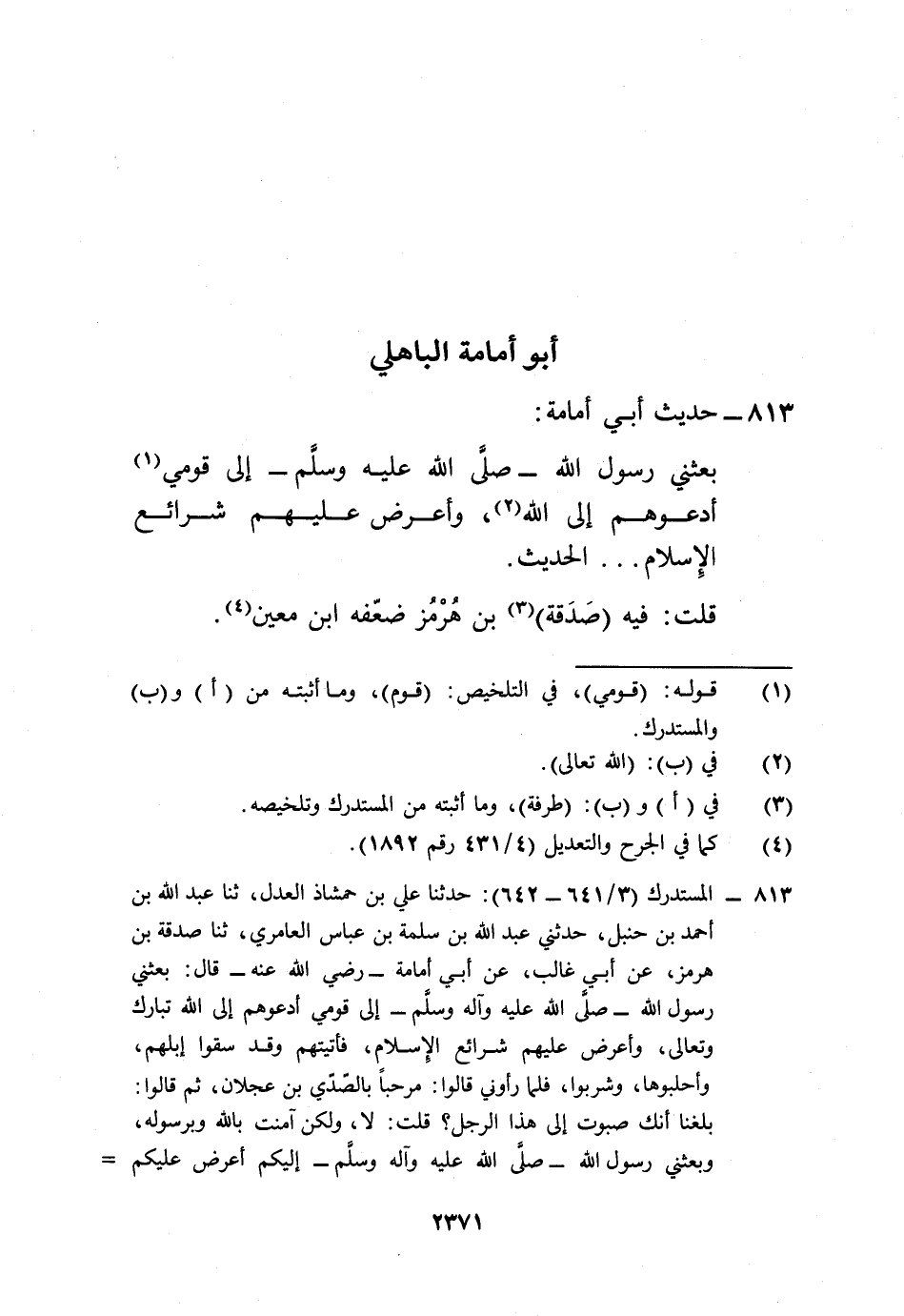 813 - المستدرك (3/ 641 - 642): حدثنا علي بن حمشاذ العدل، ثنا عبد الله بن أحمد بن حنبل، حدثني عبد الله بن سلمة بن عباس العامري، ثنا صدقة بن هرمز، عن أبي غالب، عن أبي أمامة -رضي الله عنه- قال: بعثني رسول الله -صلى الله عليه وآله وسلم- إلى قومي أدعوهم إلى الله تبارك وتعالى، وأعرض عليهم شرائع الِإسلام، فأتيتهم وقد سقوا إبلهم، وأحلبوها، وشربوا، فلما رأوني قالوا: مرحباً بالصّدّي بن عجلان، ثم قالوا: بلغنا أنك صبوت إلى هذا الرجل؟ قلت: لا، ولكن آمنت بالله وبرسوله، وبعثني رسول الله -صلى الله عليه وآله وسلم- إليكم أعرض عليكم =