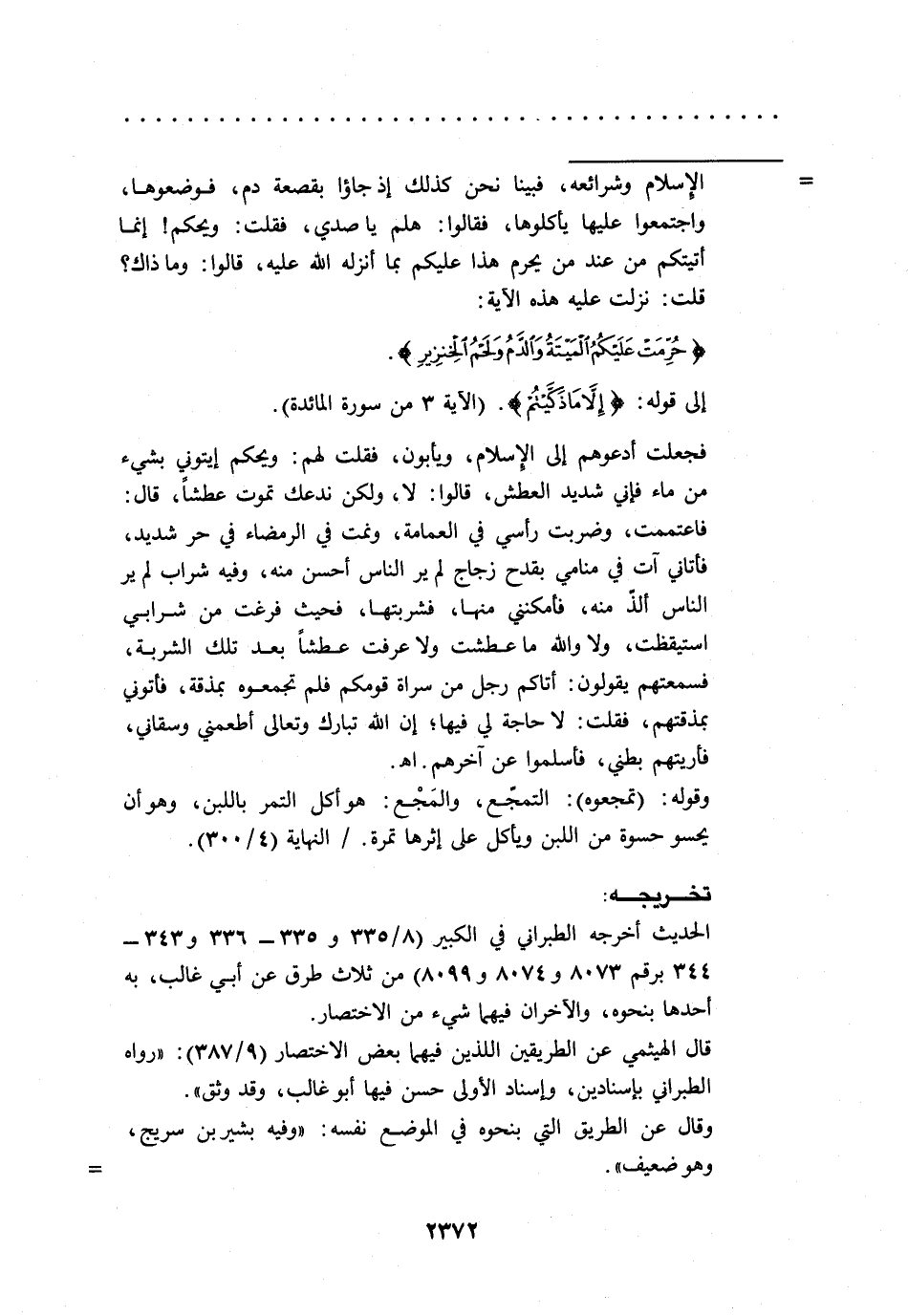 = الإسلام وشرائعه، فبينا نحن كذلك إذ جاؤا بقصعة دم، فوضعوها، واجتمعوا عليها يأكلوها، فقالوا: هلم يا صدي، فقلت: ويحكم! إنما أتيتكم من عند من يحرم هذا عليكم بما أنزله الله عليه، قالوا: وما ذاك؟ قلت: نزلت عليه هذه الآية: