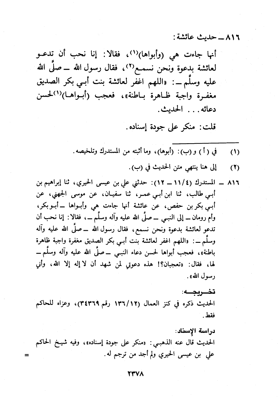 816 - المستدرك (4/ 11 - 12): حدثني علي بن عيسى الحيري، ثنا إبراهيم بن أبي طالب، ثنا ابن أبي عمر، ثنا سفيان، عن موسى الجهني، عن أبي بكر بن حفص، عن عائشة أنها جاءت هي وأبواها -أبو بكر، وأم رومان- إلى النبي -صلى الله عليه وآله وسلم-، فقالا: إنا نحب أن تدعو لعائشة بدعوة ونحن نسمع، فقال رسول الله -صلى الله عليه وآله وسلم-: "اللهم اغفر لعائشة بنت أبي بكر الصديق مغفرة واجبة ظاهرة باطنة"، فعجب أبواها لحسن دعاء النبي -صلى الله عليه وآله وسلم- لها، فقال: "تعجبان؟! هذه دعوتي لمن شهد أن لا اله إلا الله، وأني رسول الله".