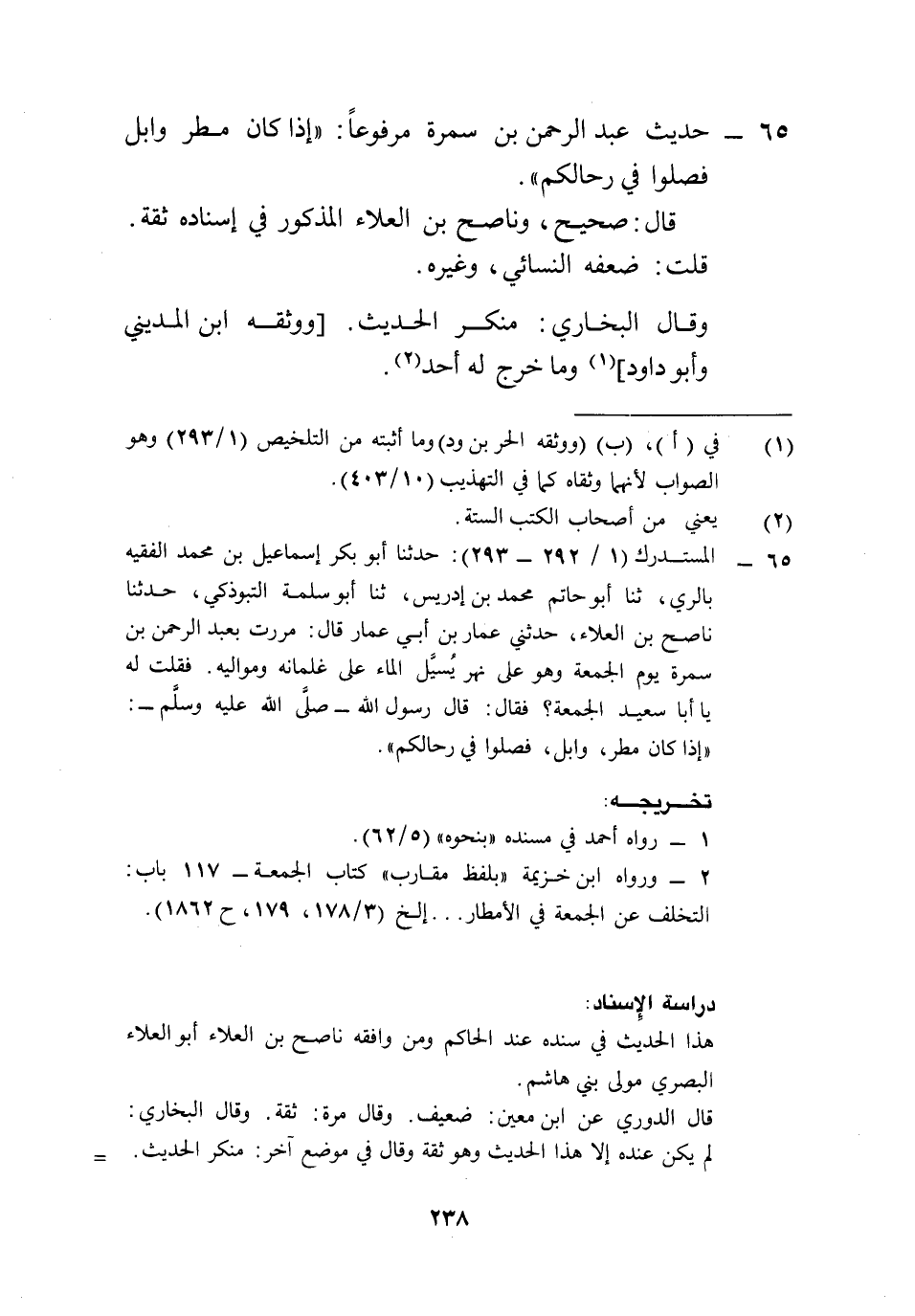 65 - المستدرك (1/ 292 - 293): حدثنا أبو بكر إسماعيل بن محمد الفقيه بالري، ثنا أبو حاتم محمد بن إدريس، ثنا أبو سلمة التبوذكي، حدثنا ناصح بن العلاء، حدثني عمار بن أبي عمار قال: مررت بعبد الرحمن بن سمرة يوم الجمعة وهو على نهر يُسيَّل الماء على غلمانه ومواليه. فقلت له يا أبا سعيد الجمعة؟ فقال: قال رسول الله -صلى الله عليه وسلم-: "إذا كان مطر، وابل، فصلوا في رحالكم".