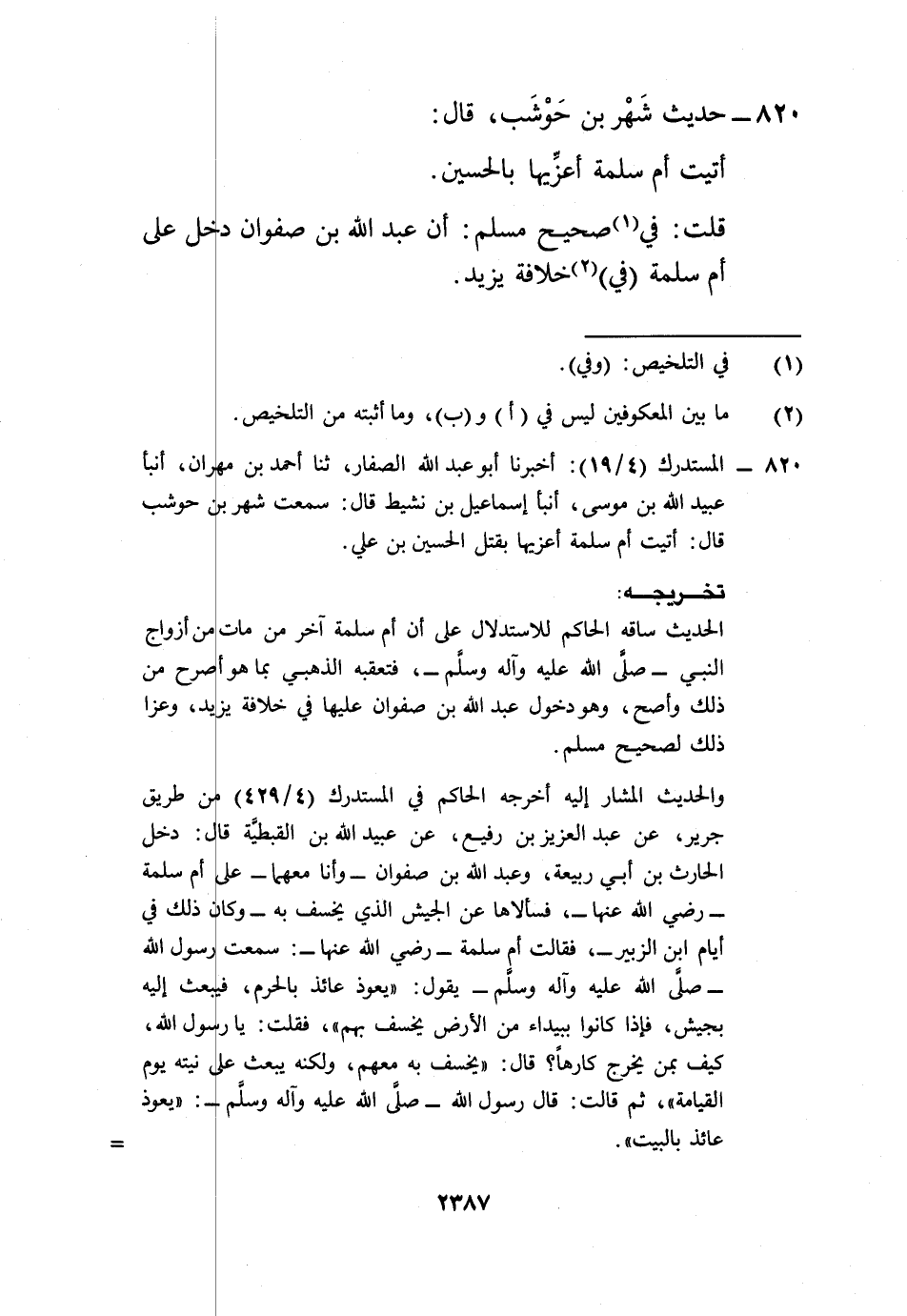 820 - المستدرك (4/ 19): أخبرنا أبو عبد الله الصفار، ثنا أحمد بن مهران، أنبأ عبيد الله بن موسى، أنبأ إسماعيل بن نشيط قال: سمعت شهر بن حوشب قال: أتيت أم سلمة أعزيها بقتل الحسين بن علي.