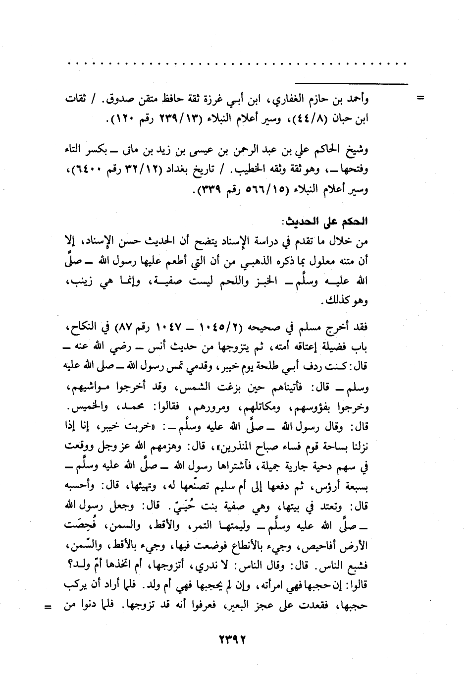 فقد أخرج مسلم في صحيحه (2/ 1045 - 1047رقم 87) في النكاح، باب فضيلة إعتاقه أمته، ثم يتزوجها من حديث أنس -رضي الله عنه- قال: كنت ردف أبي طلحة يوم خيبر، وقدمي تمس رسول الله -صلى الله عليه وسلم- قال: فأتيناهم حين بزغت الشمس، وقد أخرجوا مواشيهم، وخرجوا بفؤوسهم، ومكاتلهم، ومرورهم، فقالوا: محمد، والخميس. قال: وقال رسول الله -صلى الله عليه وسلم-: "خربت خيبر، إنا إذا نزلنا بساحة قوم فساء صباح المنذرين"، قال: وهزمهم الله عز وجل ووقعت في سهم دحية جارية جميلة، فاشتراها رسول الله -صلى الله عليه وسلم- بسبعة أرؤس، ثم دفعها إلى أم سليم تصنّعها له، وتهيئها، قال: وأحسبه قال: وتعتد في بيتها، وهي صفية بنت حُيَيّ. قال: وجعل رسول الله -صلى الله عليه وسلم- وليمتها التمر، والأقط، والسمن، فُحِصَت الأرض أفاحيص، وجيء بالأنطاع فوضعت فيها، وجيء بالأقط، والسّمن، فشبع الناس. قال: وقال الناس: لا ندري، أتزوجها، أم اتخذها أمّ ولد؟ قالوا: إن حجبها فهي امرأته، وإن لم يحجبها فهي أم ولد. فلما أراد أن يركب حجبها، فقعدت على عجز البعير، فعرفوا أنه قد تزوجها. فلما دنوا من =