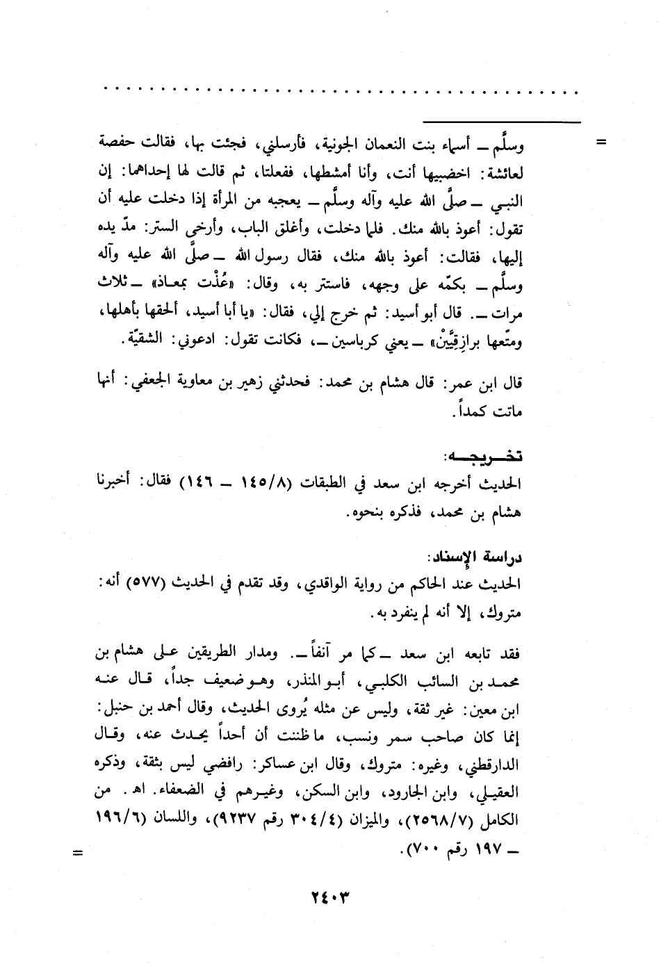فقد تابعه ابن سعد -كما مر آنفاً-. ومدار الطريقين على هشام بن محمد بن السائب الكلبي، أبو المنذر، وهو ضعيف جداً، قال عنه ابن معين: غير ثقة، وليس عن مثله يُروى الحديث، وقال أحمد بن حنبل: إنما كان صاحب سمر ونسب، ما ظننت أن أحداً يحدث عنه، وقال الدارقطني، وغيره: متروك، وقال ابن عساكر: رافضي ليس بثقة، وذكره العقيلي، وابن الجارود، وابن السكن، وغيرهم في الضعفاء. اهـ. من الكامل (7/ 2568)، والميزان (4/ 304رقم 9237)، واللسان (6/ 196 - 197 رقم 700). =