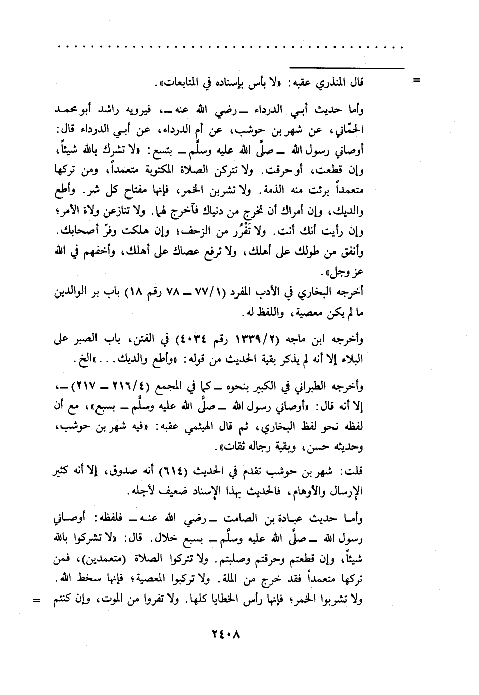 وأما حديث أبي الدرداء -رضي الله عنه -، فيرويه راشد أبو محمد الحماني، عن شهر بن حوشب، عن أم الدرداء، عن أبي الدرداء قال: أوصاني رسول الله -صلى الله عليه وسلم- بتسع: "لا تشرك بالله شيئاً، وإن قطعت، أو حرقت. ولا تتركن الصلاة المكتوبة متعمداً، ومن تركها متعمداً برئت منه الذمة. ولا تشربن الخمر، فإنها مفتاح كل شر. وأطع والديك، وإن أمراك أن تخرج من دنياك فآخرج لهما. ولا تنازعن ولاة الأمر؛ وإن رأيت أنك أنت. ولا تَفْرُر من الزحف؛ وإن هلكت وفرّ أصحابك.
