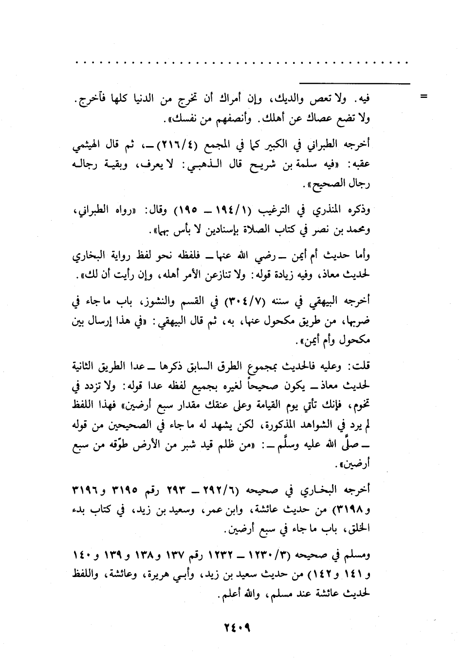 قلت: وعليه فالحديث بمجموع الطرق السابق ذكرها -عدا الطريق الثانية لحديث معاذ- يكون صحيحاً لغيره بجميع لفظه عدا قوله: ولا تزدد في تخوم، فإنك تأتي يوم القيامة وعلى عنقك مقدار سبع أرضين" فهذا اللفظ لم يرد في الشواهد المذكورة، لكن يشهد له ما جاء في الصحيحين من قوله -صلى الله عليه وسلم-: "من ظلم قيد شبر من الأرض طوّقه من سبع أرضين".