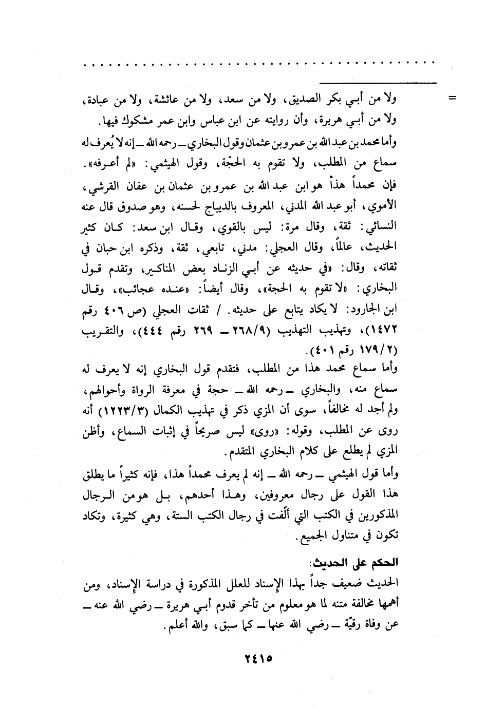وأما محمد بن عبد الله بن عمرو بن عثمان وقول البخاري -رحمه الله- إنه لا يُعرف له سماع من المطلب، ولا تقوم به الحجّة، وقوله الهيثمي: "لم أعرفه".
