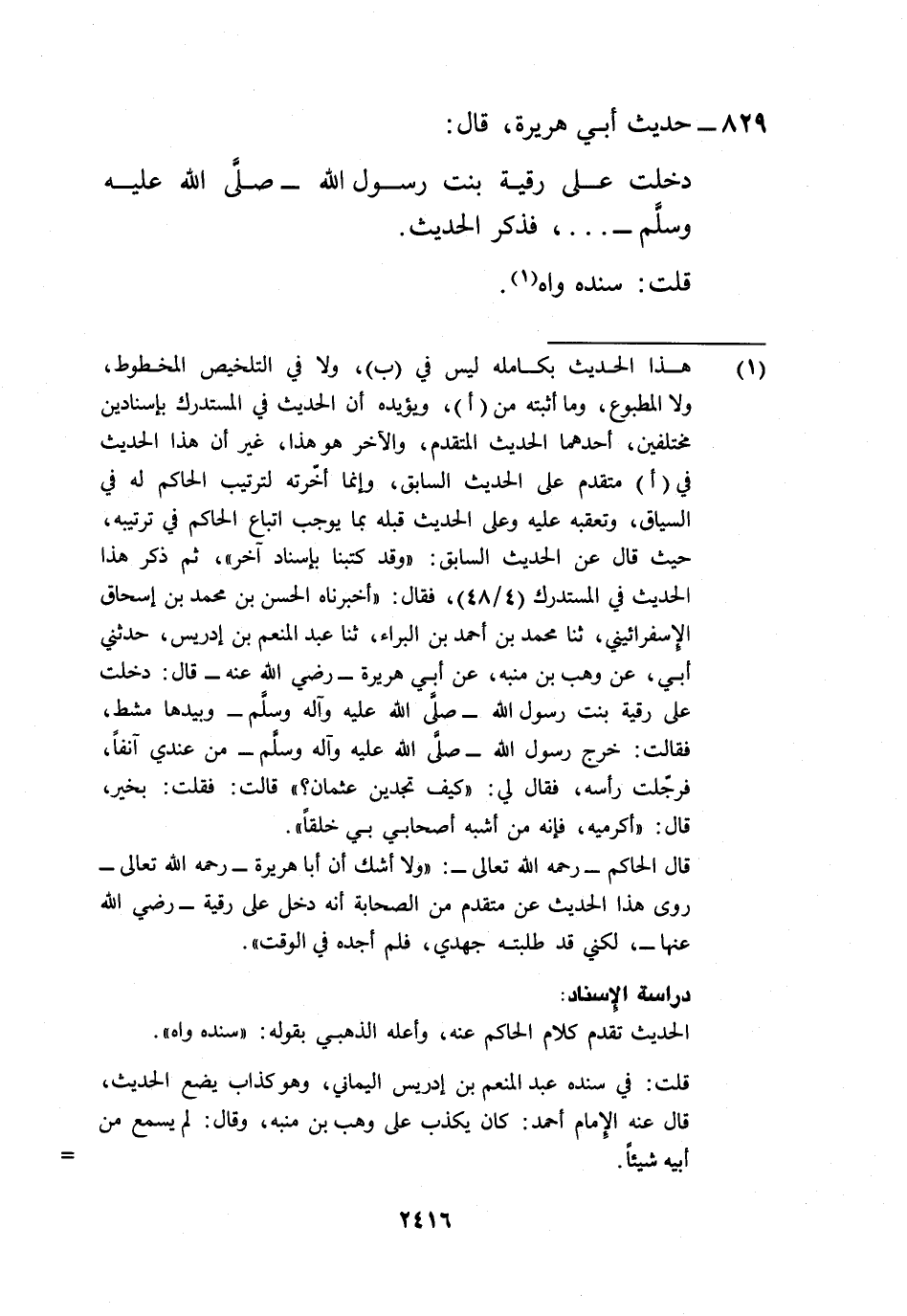 قال الحاكم -رحمه الله تعالى-: "ولا أشك أن أبا هريرة -رحمه الله تعالى- روى هذا الحديث عن متقدم من الصحابة أنه دخل على رقية -رضي الله عنها-، لكني قد طلبته جهدي، فلم أجده في الوقت".