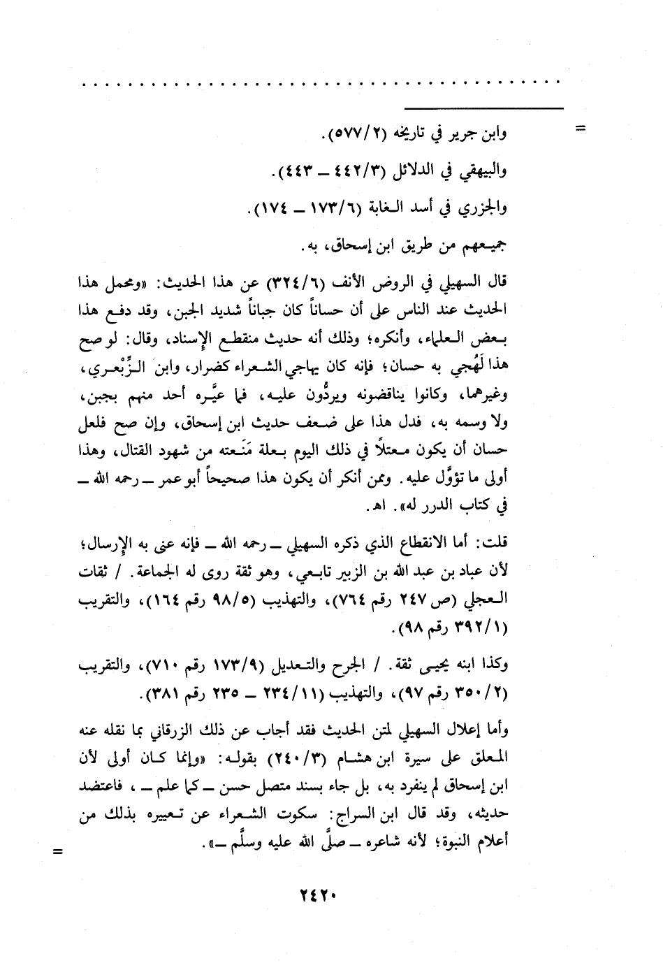 وأما إعلال السهيلي لمتن الحديث فقد أجاب عن ذلك الزرقاني بما نقله عنه المعلق على سيرة ابن هشام (3/ 240) بقوله: "وإنما كان أولى لأن ابن إسحاق لم ينفرد به، بل جاء بسند متصل حسن -كما علم-، فاعتضد حديثه، وقد قال ابن السراج: سكوت الشعراء عن تعييره بذلك من أعلام النبوة ة لأنه شاعره -صلى الله عليه وسلم -". =