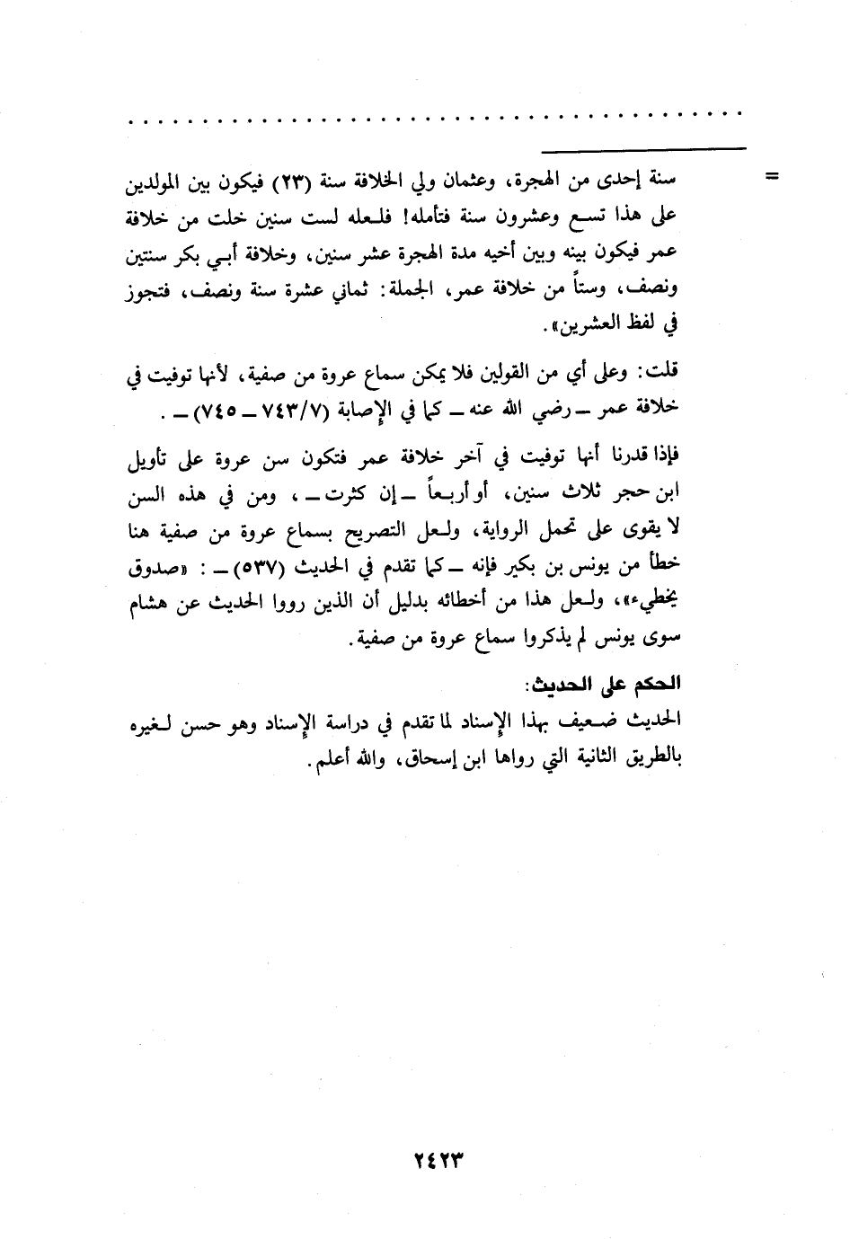 قلت: وعلى أي من القولين فلا يمكن سماع عروة من صفية، لأنها توفيت في خلافة عمر -رضي الله عنه -كما في الإصابة (7/ 743 - 745) -.