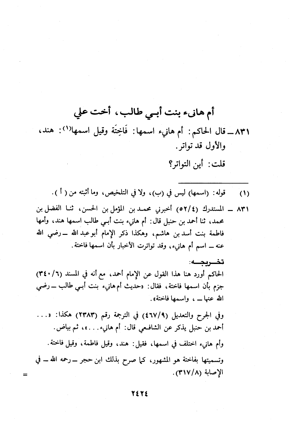 831 - المستدرك (4/ 52) أخبرني محمد بن المؤمل بن الحسن، ثنا الفضل بن محمد، ثنا أحمد بن حنبل قال: أم هانيء بنت أبي طالب اسمها هند، وأمها فاطمة بنت أسد بن هاشم، وهكذا ذكر الِإمام أبو عبد الله -رضي الله عنه- اسم أم هانيء، وقد تواترت الأخبار بأن اسمها فاختة.