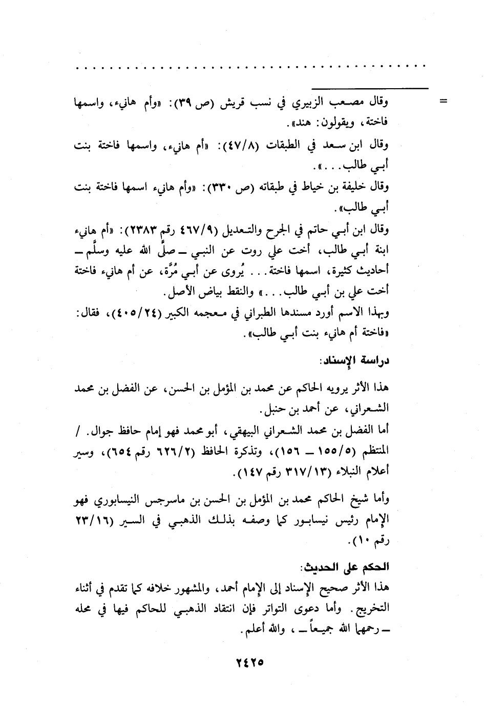 وقال ابن أبي حاتم في الجرح والتعديل (9/ 467رقم 2383): "أم هانيء ابنة أبي طالب، أخت علي روت عن النبي -صلى الله عليه وسلم- أحاديث كثيرة، اسمها فاختة ... يُروى عن أبي مُرَّة، عن أم هانيء فاختة أخت علي بن أبي طالب ... " والنقط بياض الأصل.
