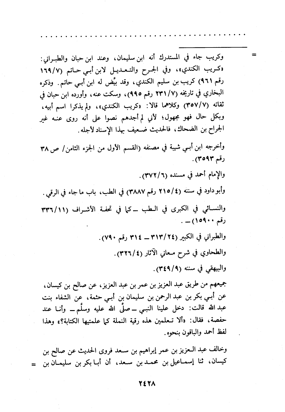 جميعهم من طريق عبد العزيز بن عمر بن عبد العزيز، عن صالح بن كيسان، عن أبي بكر بن عبد الرحمن بن سليمان بن أبي حثمة، عن الشفاء بنت عبد الله قالت: دخل علينا النبي -صلى الله عليه وسلم- وأنا عند حفصة، فقال: "ألا تعلمين هذه رقية النملة كما علمتيها الكتابة؟ " وهذا لفظ أحمد والباقون بنحوه.