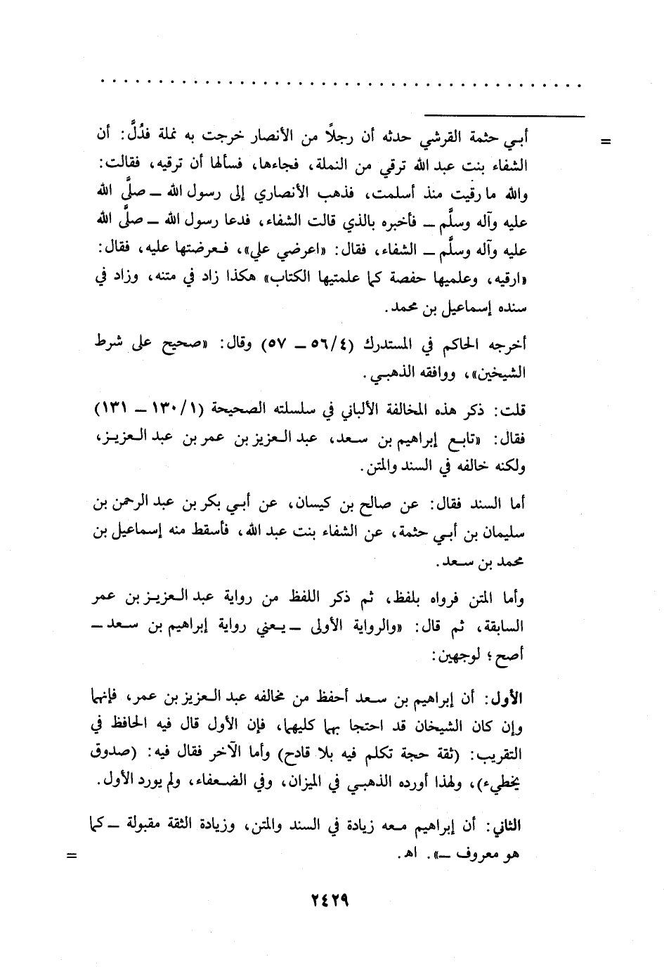 = أبي حثمة القرشي حدثه أن رجلًا من الأنصار خرجت به نملة فدُلَّ: أن الشفاء بنت عبد الله ترقي من النملة، فجاءها، فسألها أن ترقيه، فقالت: والله ما رقيت منذ أسلمت، فذهب الأنصاري إلى رسول الله -صلى الله عليه وآله وسلم- فأخبره بالذي قالت الشفاء، فدعا رسول الله -صلى الله عليه وآله وسلم- الشفاء، فقال: "اعرضي علي"، فعرضتها عليه، فقال: "ارقيه، وعلميها حفصة كما علمتيها الكتاب" هكذا زاد في متنه، وزاد في سنده إسماعيل بن محمد.
