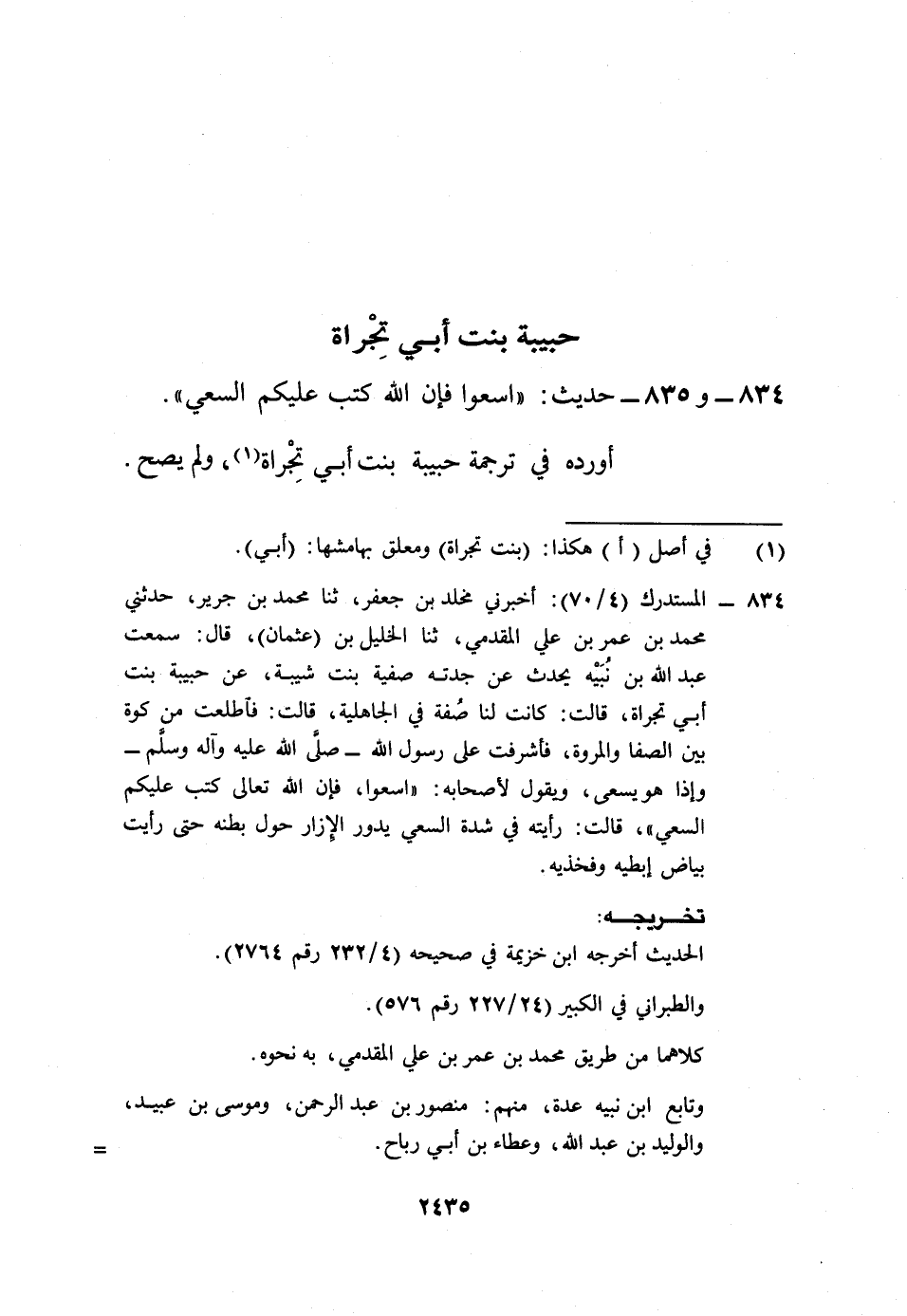 834 - المستدرك (4/ 70): أخبرني مخلد بن جعفر، ثنا محمد بن جرير، حدثني محمد بن عمر بن علي المقدمي، ثنا الخليل بن (عثمان)، قال: سمعت عبد الله بن نُبَيْه يحدث عن جدته صفية بنت شيبة، عن حبيبة بنت أبي تجراة، قالت: كانت لنا صُفة في الجاهلية، قالت: فآطلعت من كوة بين الصفا والمروة، فأشرفت على رسول الله -صلى الله عليه وآله وسلم- وإذا هو يسعى، ويقول لأصحابه: "اسعوا، فإن الله تعالى كتب عليكم السعي"، قالت: رأيته في شدة السعي يدور الإزار حول بطنه حتى رأيت بياض إبطيه وفخذيه.