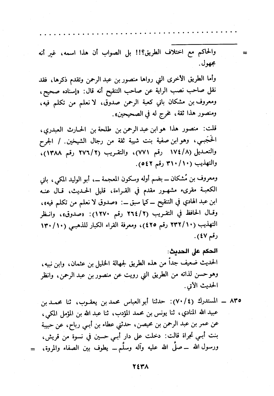 835 - المستدرك (4/ 70): حدثنا أبو العباس محمد بن يعقوب، ثنا محمد بن عبيد الله المنادي، ثنا يونس بن محمد المؤدب، ثنا عبد الله بن المؤمل المكي، عن عمر بن عبد الرحمن بن محيصن، حدثني عطاء بن أبي رباح، عن حبيبة بنت أبي تجراة قالت: دخلت على دار أبي حسين في نسوة من قريش، ورسول الله -صلى الله عليه وآله وسلم- يطوف بين الصفاء والمروة، =