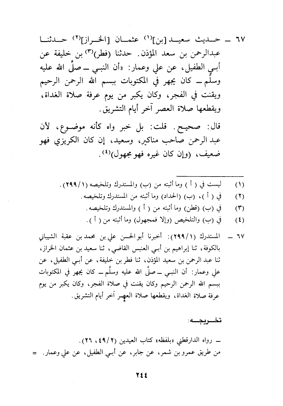 67 - المستدرك (1/ 299): أخبرنا أبو الحسن علي بن محمد بن عقبة الشيباني بالكوفة، ثنا إبراهيم بن أبي العنبس القاضي، ثنا سعيد بن عثمان الخراز، ثنا عبد الرحمن بن سعيد المؤذن، ثنا فطر بن خليفة، عن أبي الطفيل، عن علي وعمار: أن النبي -صلى الله عليه وسلم- كان يجهر في المكتوبات ببسم الله الرحمن الرحيم وكان يقنت في صلاة الفجر، وكان يكبر من يوم عرفة صلاة الغداة، ويقطعها صلاة العصر آخر أيام التشريق.