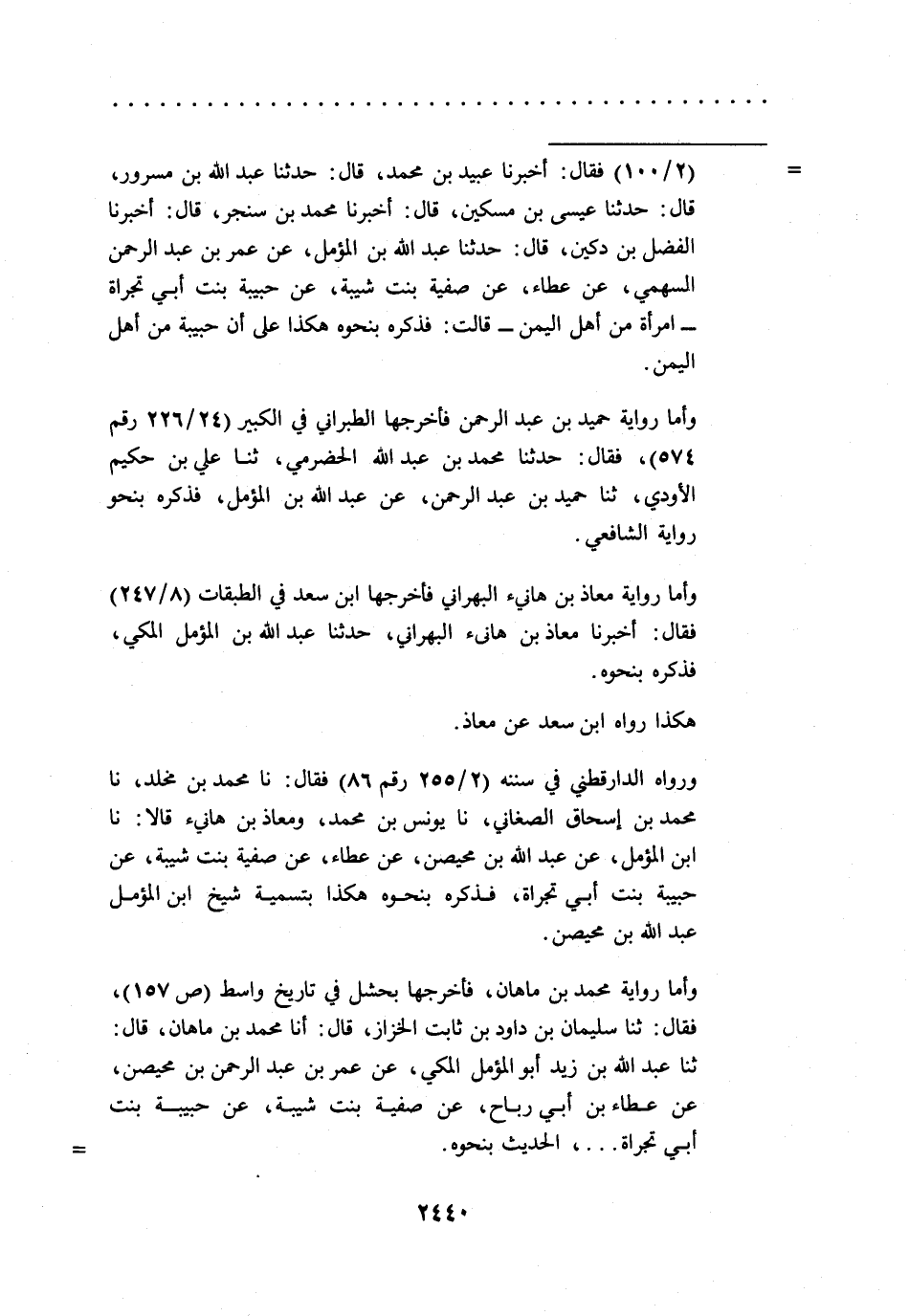 وأما رواية محمد بن ماهان، فأخرجها بحشل في تاريخ واسط (ص 157)، فقال: ثنا سليمان بن داود بن ثابت الخزاز، قال: أنا محمد بن ماهان، قال: ثنا عبد الله بن زيد أبو المؤمل المكي، عن عمر بن عبد الرحمن بن محيصن، عن عطاء بن أبي رباح، عن صفية بنت شيبة، عن حبيبة بنت أبي تجراة ... ، الحديث بنحوه. =