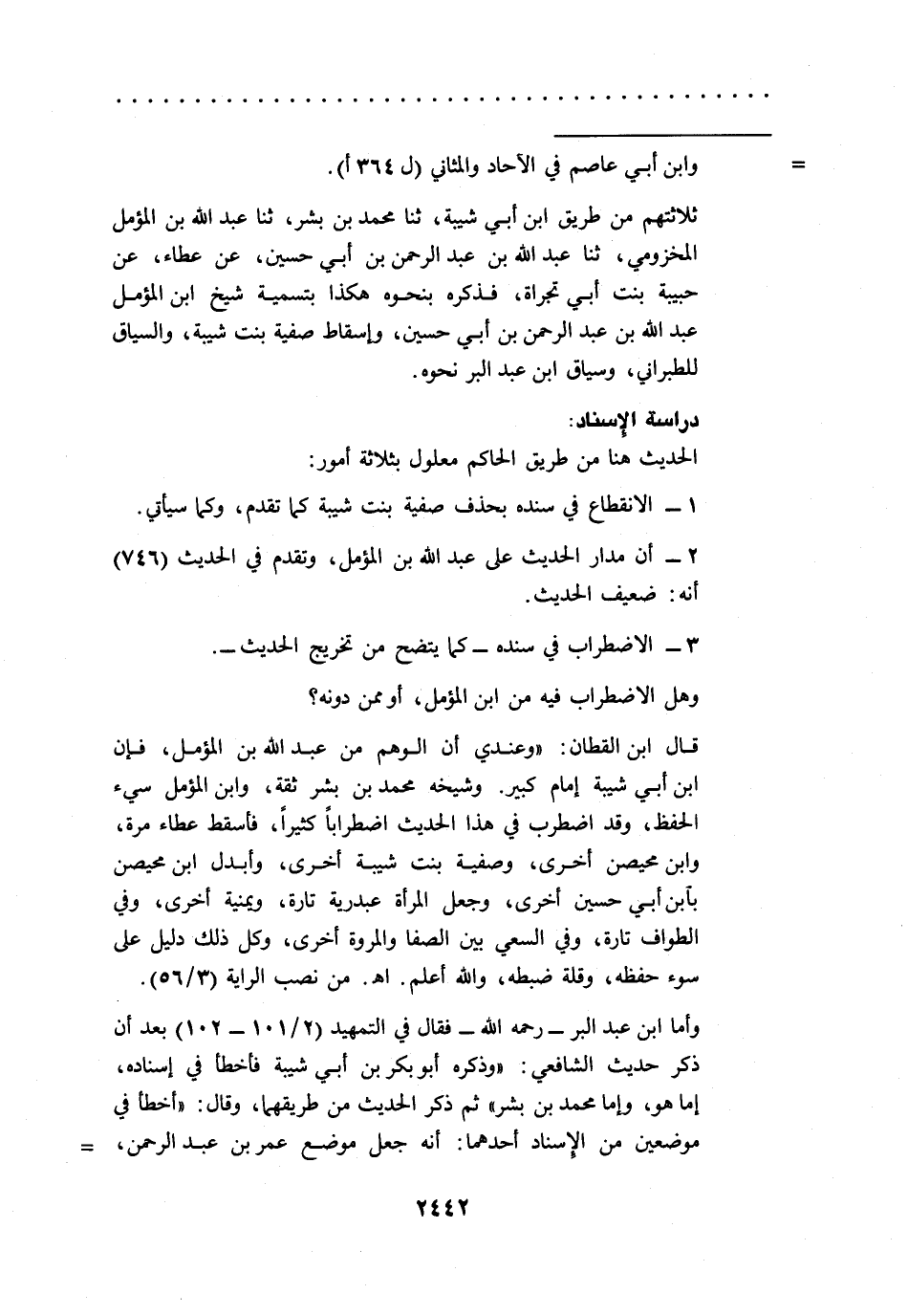 وأما ابن عبد البر -رحمه الله- فقال في التمهيد (2/ 101 - 102) بعد أن ذكر حديث الشافعي: "وذكره أبو بكر بن أبي شيبة فأخطأ في إسناده، إما هو، وإما محمد بن بشر" ثم ذكر الحديث من طريقهما، وقال: "أخطأ في موضعين من الإسناد أحدهما: أنه جعل موضع عمر بن عبد الرحمن، =