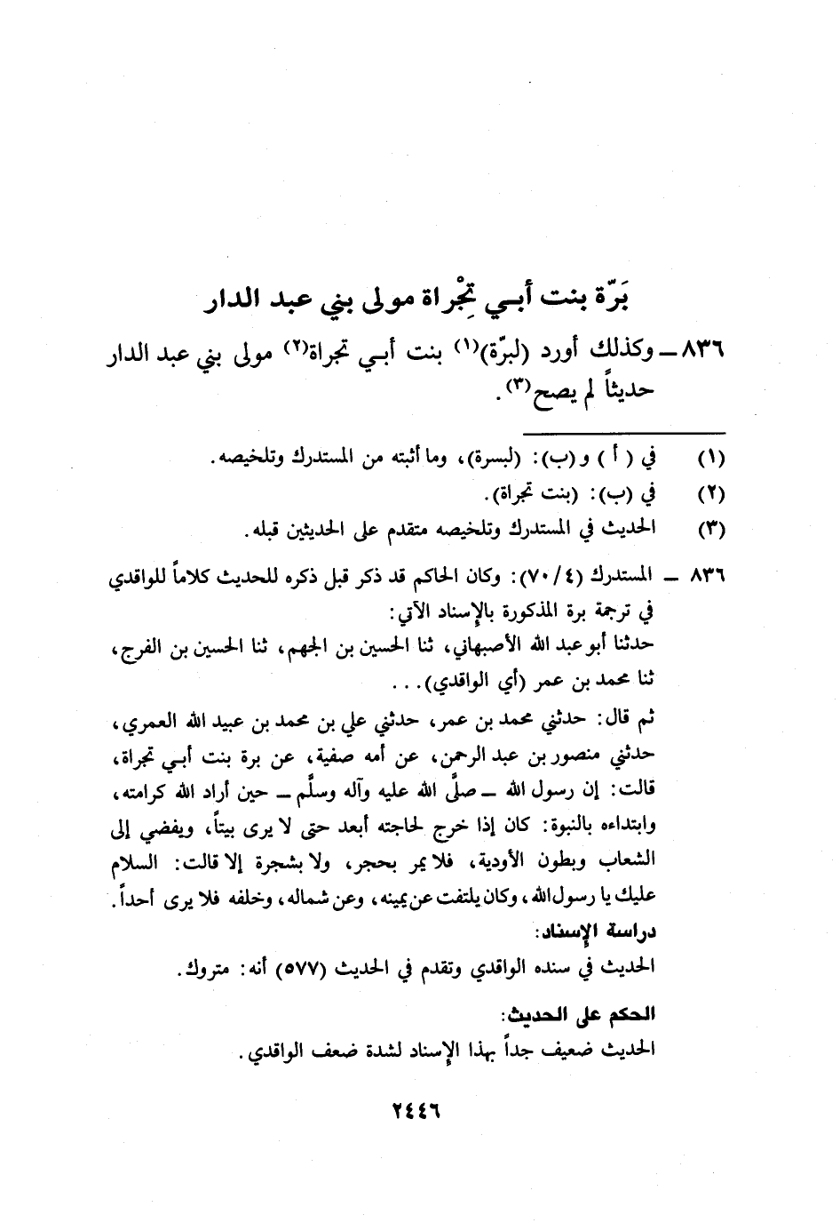 836 - وكذلك أورد (لبرّة) (¬1) بنت أبي تجراة (¬2) مولى بني عبد الدار حديثاً لم يصح (¬3).