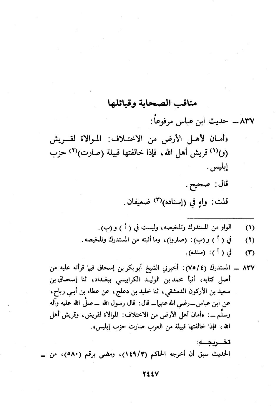 837 - المستدرك (4/ 75): أخبرني الشيخ أبو بكر بن إسحاق فيما قرأته عليه من أصل كتابه، أنبأ محمد بن الوليد الكرابيسي ببغداد، ثنا إسحاق بن سعيد بن الأركون الدمشقي، ثنا خليد بن دعلج، عن عطاء بن أبي رباح، عن ابن عباس -رضي الله عنهما- قال: قال رسول الله -صلى الله عليه وآله وسلم-: "أمان أهل الأرض من الاختلاف: الموالاة لقريش، وقريش أهل الله، فإذا خالفتها قبيلة من العرب صارت حزب إبليس".