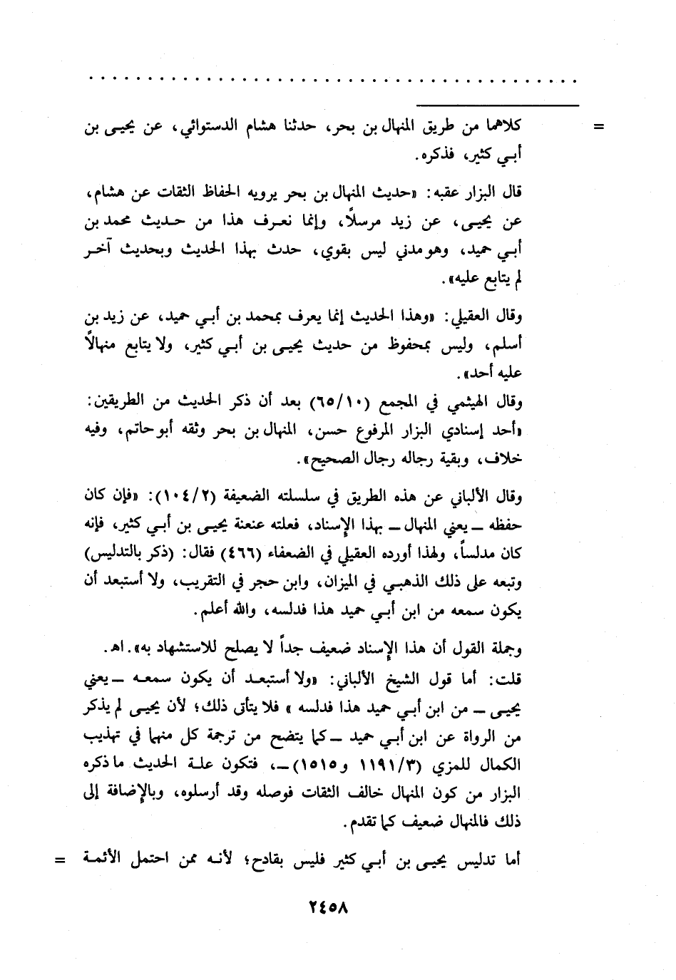 وقال الألباني عن هذه الطريق في سلسلته الضعيفة (2/ 104): "فإن كان حفظه -يعني المنهال- بهذا الإسناد، فعلته عنعنة يحيى بن أبي كثير، فإنه كان مدلساً، ولهذا أورده العقيلي في الضعفاء (466) فقال: (ذكر بالتدليس) وتبعه على ذلك الذهبي في الميزان، وابن حجر في التقريب، ولا أستبعد أن يكون سمعه من ابن أبي حميد هذا فدلسه، والله أعلم.