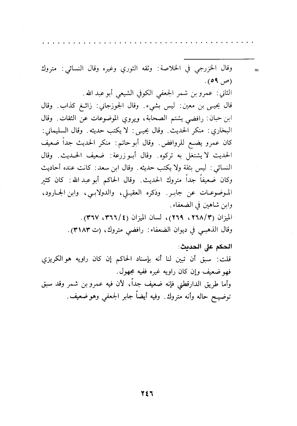 وأما طريق الدارقطني فإنه ضعيف جداً، لأن فيه عمرو بن شمر وقد سبق توضيح حاله وأنه متروك. وفيه أيضاً جابر الجعفي وهو ضعيف.