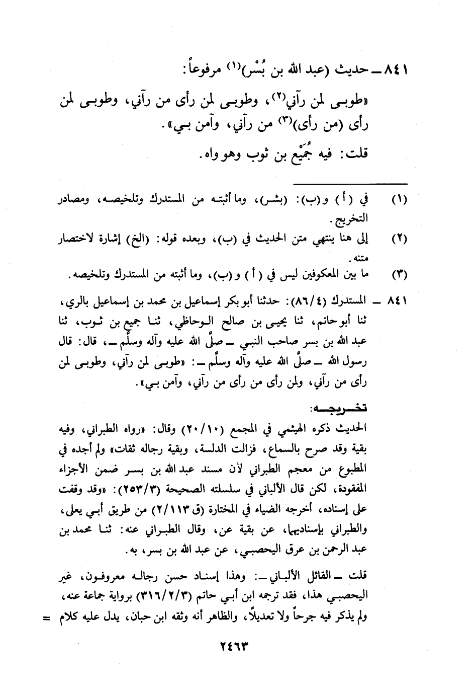 841 - المستدرك (4/ 86): حدثنا أبو بكر إسماعيل بن محمد بن إسماعيل بالري، ثنا أبو حاتم، ثنا يحيى بن صالح الوحاظي، ثنا جميع بن ثوب، ثنا عبد الله بن بسر صاحب النبي -صلى الله عليه وآله وسلم-، قال: قال رسول الله -صلى الله عليه وآله وسلم-: "طوبى لمن رآني، وطوبى لمن رأى من رآني، ولمن رأى من رأى من رآني، وآمن بي".