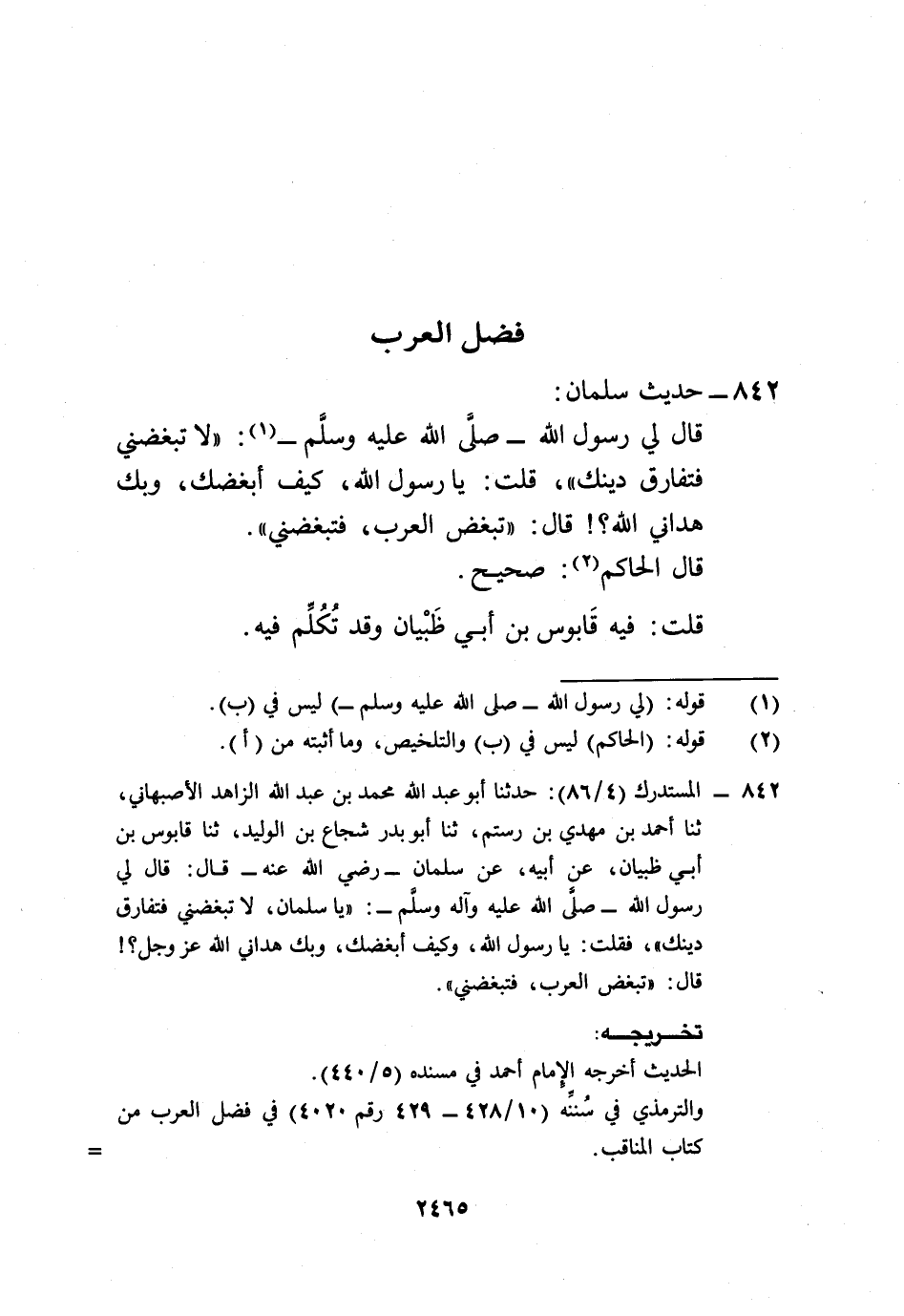 842 - المستدرك (4/ 86): حدثنا أبو عبد الله محمد بن عبد الله الزاهد الأصبهاني، ثنا أحمد بن مهدي بن رستم، ثنا أبو بدر شجاع بن الوليد، ثنا قابوس بن أبي ظبيان، عن أبيه، عن سلمان -رضي الله عنه- قال: قال لي رسول الله -صلى الله عليه وآله وسلم-: "يا سلمان، لا تبغضني فتفارق دينك"، فقلت: يا رسول الله، وكيف أبغضك، وبك هداني الله عز وجل؟! قال: "تبغض العرب، فتبغضني".