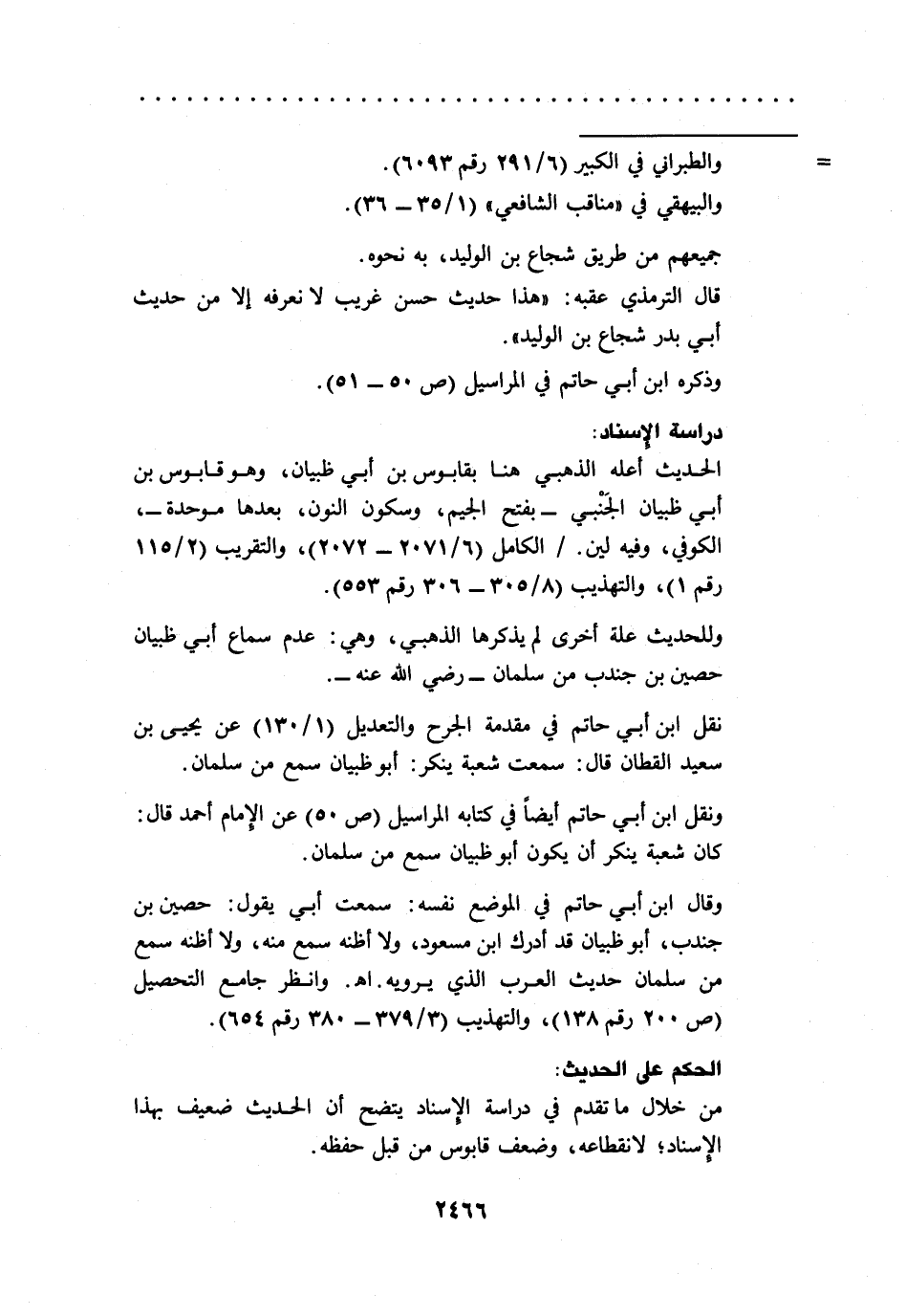 ونقل ابن أبي حاتم أيضاً في كتابه المراسيل (ص 50) عن الإمام أحمد قال: كان شعبة ينكر أن يكون أبو ظبيان سمع من سلمان.