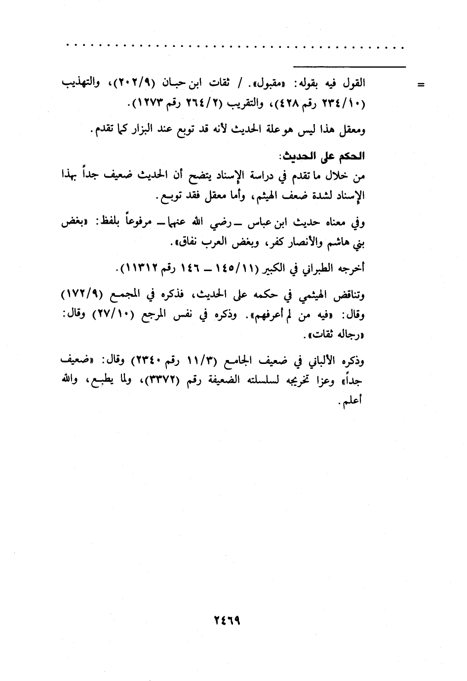 وتناقض الهيثمي في حكمه على الحديث، فذكره في المجمع (9/ 172) وقال: "فيه من لم أعرفهم". وذكره في نفس المرجع (10/ 27) وقال: "رجاله ثقات".
