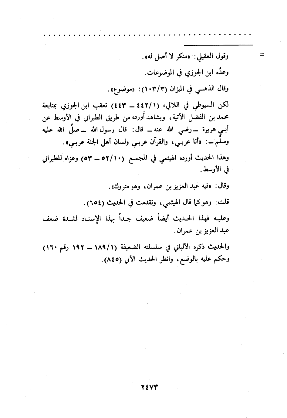 لكن السيوطي في اللآليء (1/ 442 - 443) تعقب ابن الجوزي بمتابعة محمد بن الفضل الآتية، وبشاهد أَورده من طريق الطبراني في الأوسط عن أبي هريرة -رضي الله عنه- قال: قال رسول الله -صلى الله عليه وسلم-: "أنا عربي، والقرآن عربي ولسان أهل الجنة عربي".