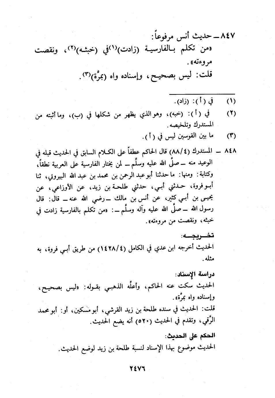 848 - المستدرك (4/ 88) قال الحاكم عطفاً على الكلام السابق في الحديث قبله في الوعيد منه -صلى الله عليه وسلم- لمن يختار الفارسية على العربية نطقاً، وكتابة: ومنها: ما حدثنا أبو عبد الرحمن بن محمد بن عبد الله البيروتي، ثنا أبو فروة، حدثني أبي، حدثني طلحة بن زيد، عن الأوزاعي، عن يحيى بن أبي كثير، عن أنس بن مالك -رضي الله عنه- قال: قال رسول الله -صلى الله عليه وآله وسلم-: "من تكلم بالفارسية زادت في خبثه، ونقصت من مروءته".