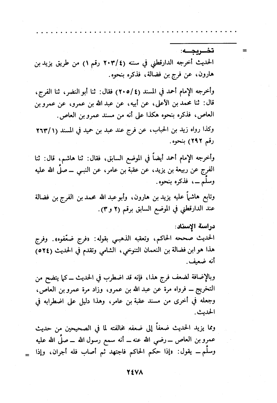 وبالإضافة لضعف فرج هذا، فإنه قد اضطرب في الحديث -كما يتضح من التخريج- فرواه مرة عن عبد الله بن عمرو، وزاد مرة عمرو بن العاص، وجعله في أخرى من مسند عقبة بن عامر، وهذا دليل على اضطرابه في الحديث.
