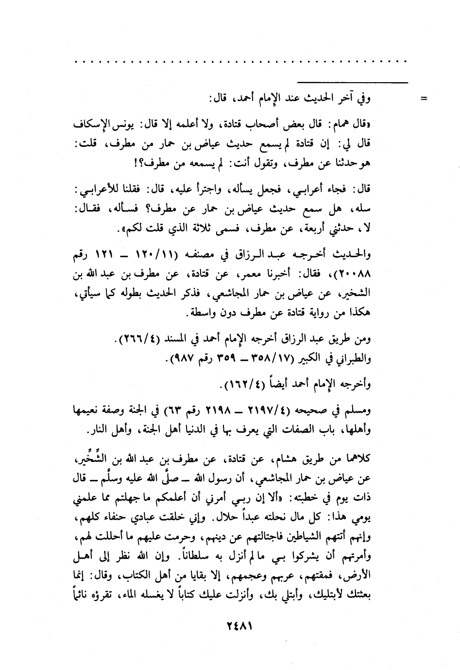 والحديث أخرجه عبد الرزاق في مصنفه (11/ 120 - 121 رقم و20088)، فقال: أخبرنا معمر، عن قتادة، عن مطرف بن عبد الله بن الشخير، عن عياض بن حمار المجاشعي، فذكر الحديث بطوله كما سيأتي، هكذا من رواية قتادة عن مطرف دون واسطة.