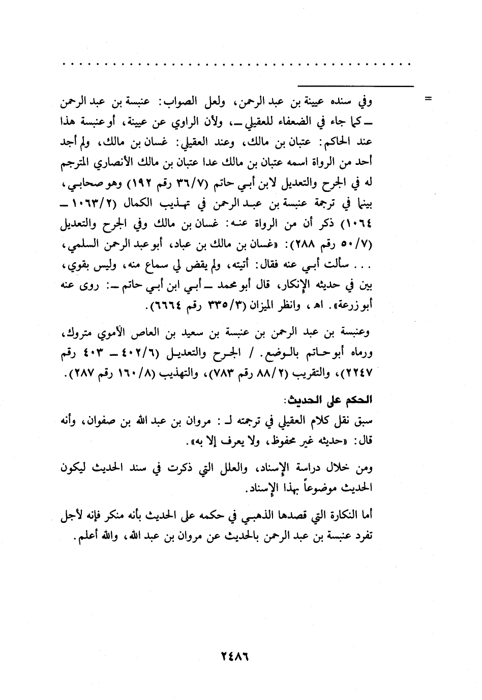 = وفي سنده عيينة بن عبد الرحمن، ولعل الصواب: عنبسة بن عبد الرحمن -كما جاء في الضعفاء للعقيلي-، ولأن الراوي عن عيينة، أو عنبسة هذا عند الحاكم: عتبان بن مالك، وعند العقيلي: غسان بن مالك، ولم أجد أحد من الرواة اسمه عتبان بن مالك عدا عتبان بن مالك الأنصاري المترجم له في الجرح والتعديل لابن أبي حاتم (7/ 36رقم 192) وهو صحابي، بينما في ترجمة عنبسة بن عبد الرحمن في تهذيب الكمال (2/ 1063 - 1064) ذكر أن من الرواة عنه: غسان بن مالك وفي الجرح والتعديل (7/ 50رقم منه 288): "غسان بن مالك بن عباد، أبو عبد الرحمن السلمي، ... سألت أبي عنه فقال: أتيته، ولم يقض لي سماع منه، وليس بقوي، بين في حديثه الإنكار، قال أبو محمد -أبي ابن أبي حاتم-: روى عنه أبو زرعة". اهـ، وانظر الميزان (3/ 335 رقم 6664).