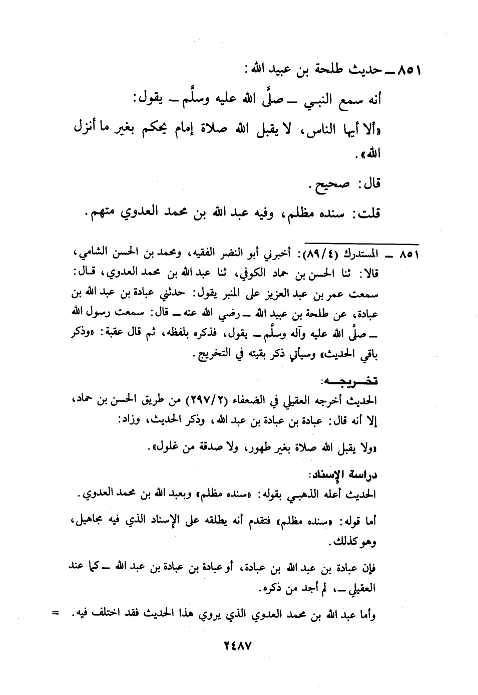 851 - المستدرك (4/ 89): أخبرني أبو النضر الفقيه، ومحمد بن الحسن الشامي، قالا: ثنا الحسن بن حماد الكوفي، ثنا عبد الله بن محمد العدوي، قال: سمعت عمر بن عبد العزيز على المنبر يقول: حدثني عبادة بن عبد الله بن عبادة، عن طلحة بن عبيد الله -رضي الله عنه- قال: سمعت رسول الله -صلى الله عليه وآله وسلم- يقول، فذكره بلفظه، ثم قال عقبة: "وذكر باقي الحديث، وسيأتي ذكر بقيته في التخريج.