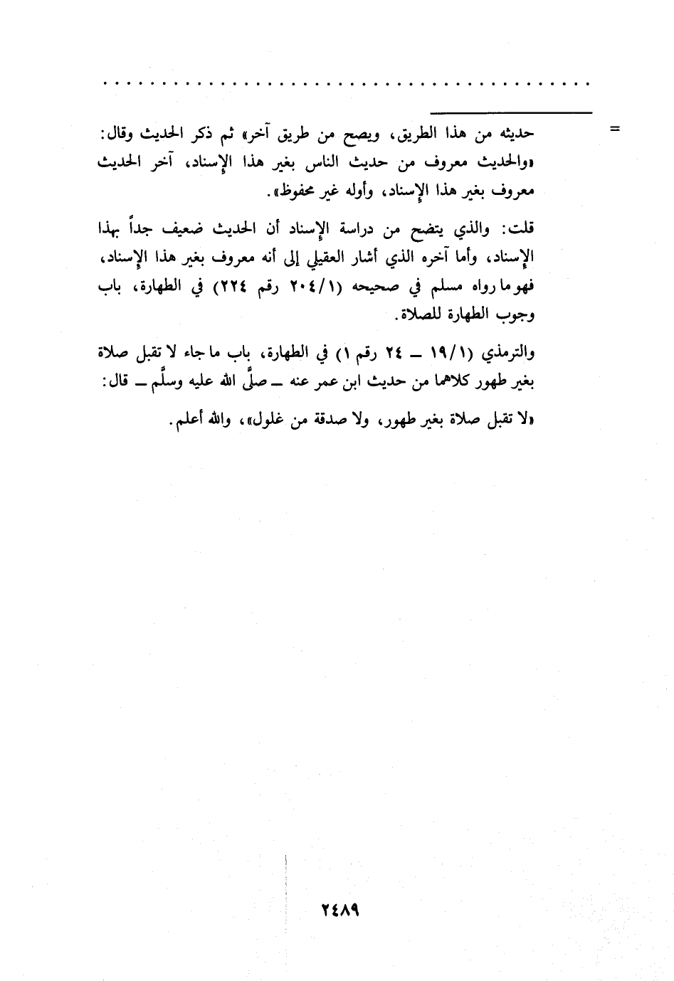 قلت: والذي يتضح من دراسة الِإسناد أن الحديث ضعيف جداً بهذا الإسناد، وأما آخره الذي أشار العقيلي إلى أنه معروف بغير هذا الِإسناد، فهو ما رواه مسلم في صحيحه (1/ 204رقم 224) في الطهارة، باب وجوب الطهارة للصلاة.