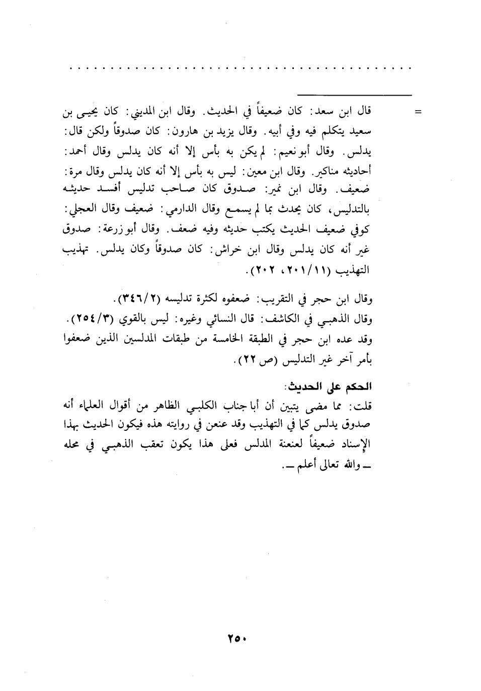 قلت: مما مضى يتبين أن أبا جناب الكلبي الظاهر من أقوال العلماء أنه صدوق يدلس كما في التهذيب وقد عنعن في روايته هذه فيكون الحديث بهذا الإِسناد ضعيفاً لعنعنة المدلس فعلى هذا يكون تعقب الذهبي في محله -والله تعالى أعلم-.