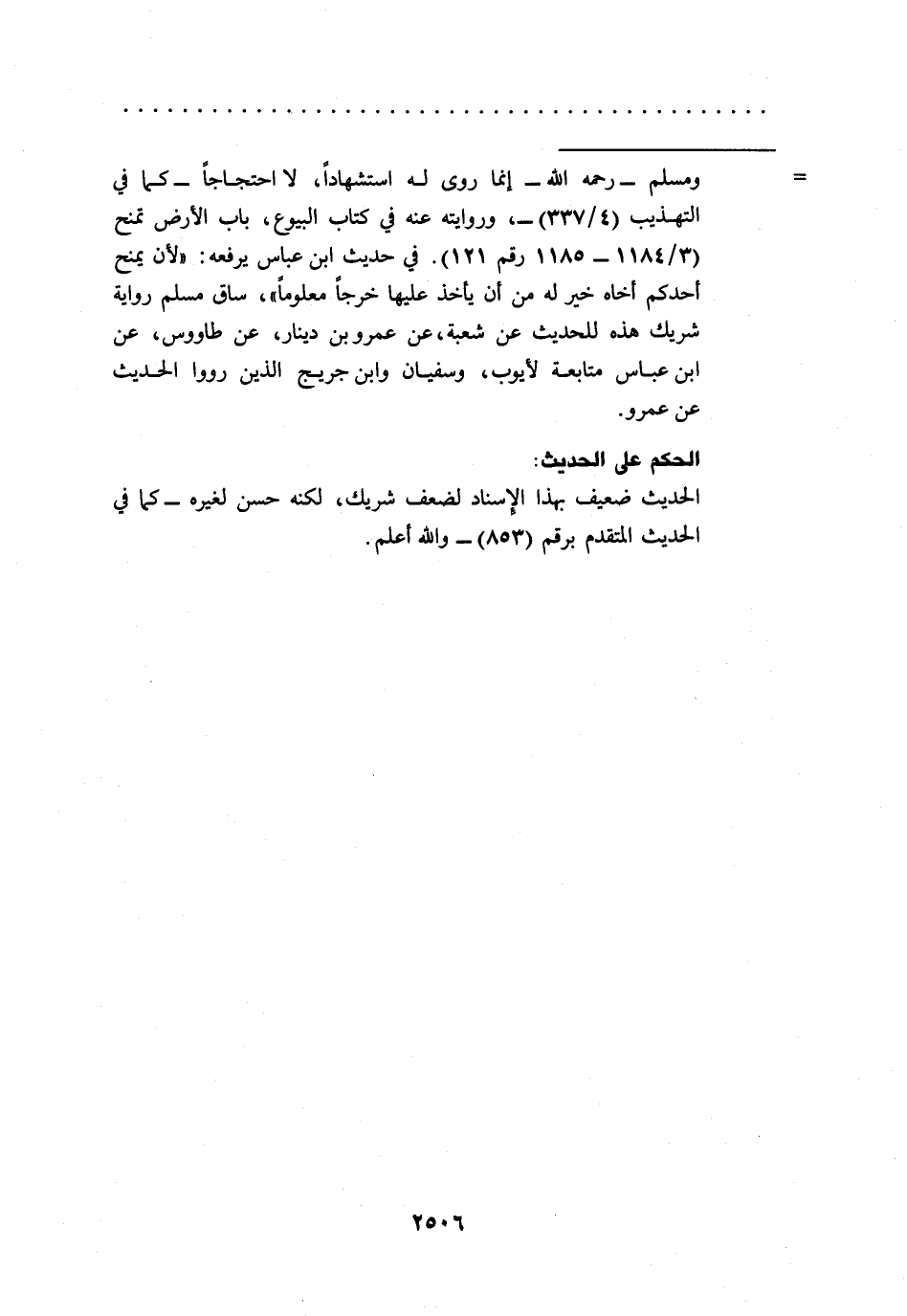 = ومسلم -رحمه الله- إنما روى له استشهاداً، لا احتجاجاً -كما في التهذيب (4/ 337) -، وروايته عنه في كتاب البيوع، باب الأرض تمنح (3/ 1184 - 1185 رقم 121). في حديث ابن عباس يرفعه: الآن يمنح أحدكم أخاه خير له من أن يأخذ عليها خرجاً معلوماً"، ساق مسلم رواية شريك هذه للحديث عن شعبة، عن عمرو بن دينار، عن طاووس، عن ابن عباس متابعة لأيوب، وسفيان وابن جريج الذين رووا الحديث عن عمرو.