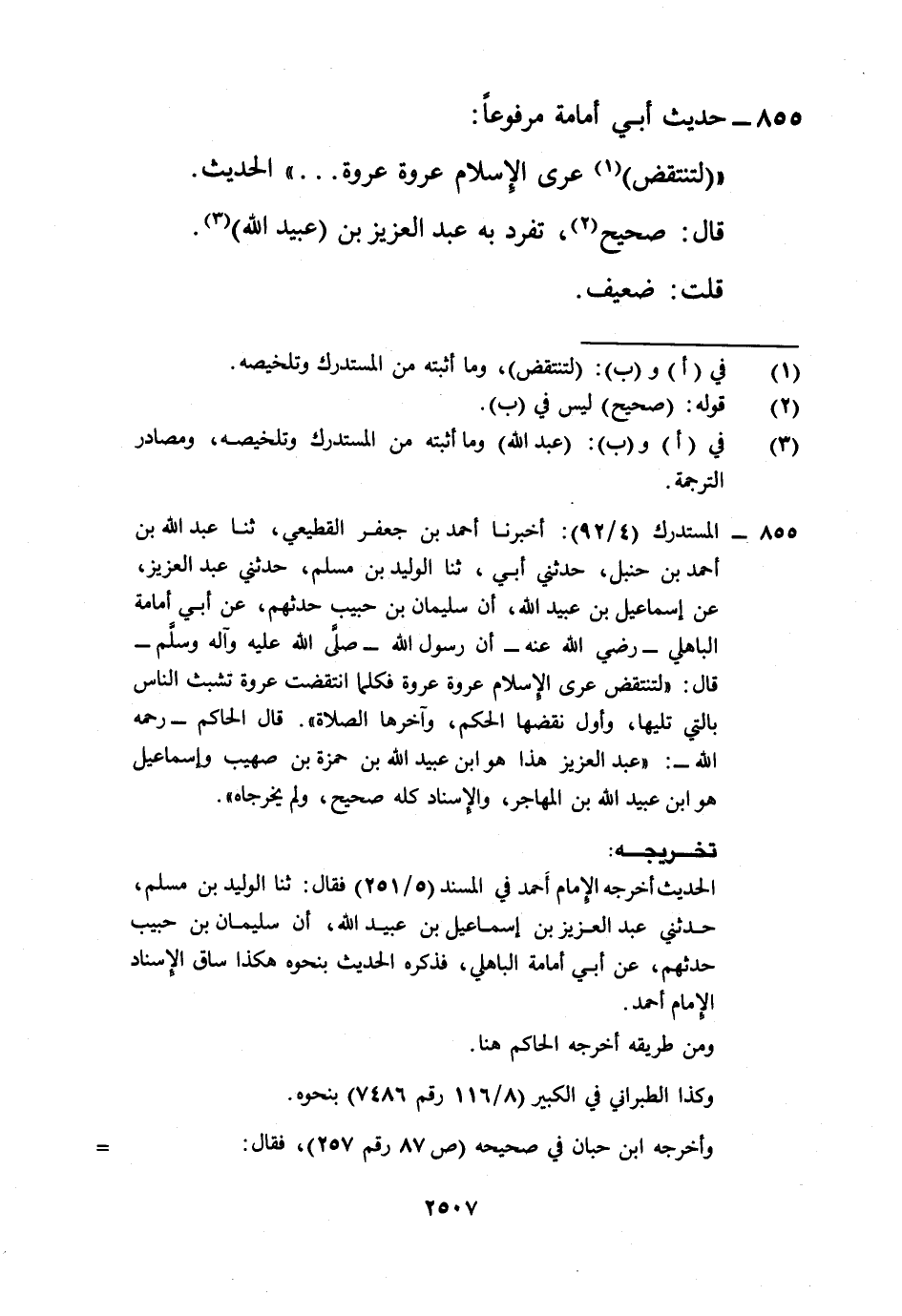 855 - المستدرك (4/ 92): أخبرنا أحمد بن جعفر القطيعي، ثنا عبد الله بن أحمد بن حنبل، حدثني أبي، ثنا الوليد بن مسلم، حدثني عبد العزيز، عن إسماعيل بن عبيد الله، أن سليمان بن حبيب حدثهم، عن أبي أمامة الباهلي -رضي الله عنه- أن رسول الله -صلى الله عليه وآله وسلم- قال: "لتنتقض عرى الإسلام عروة عروة فكلما انتقضت عروة تشبث الناس بالتي تليها، وأول نقضها الحكم، وآخرها الصلاة". قال الحاكم -رحمه الله-: "عبد العزيز هذا هو ابن عبيد الله بن حمزة بن صهيب وإسماعيل هو ابن عبيد الله بن المهاجر، والإسناد كله صحيح، ولم يخرجاه".